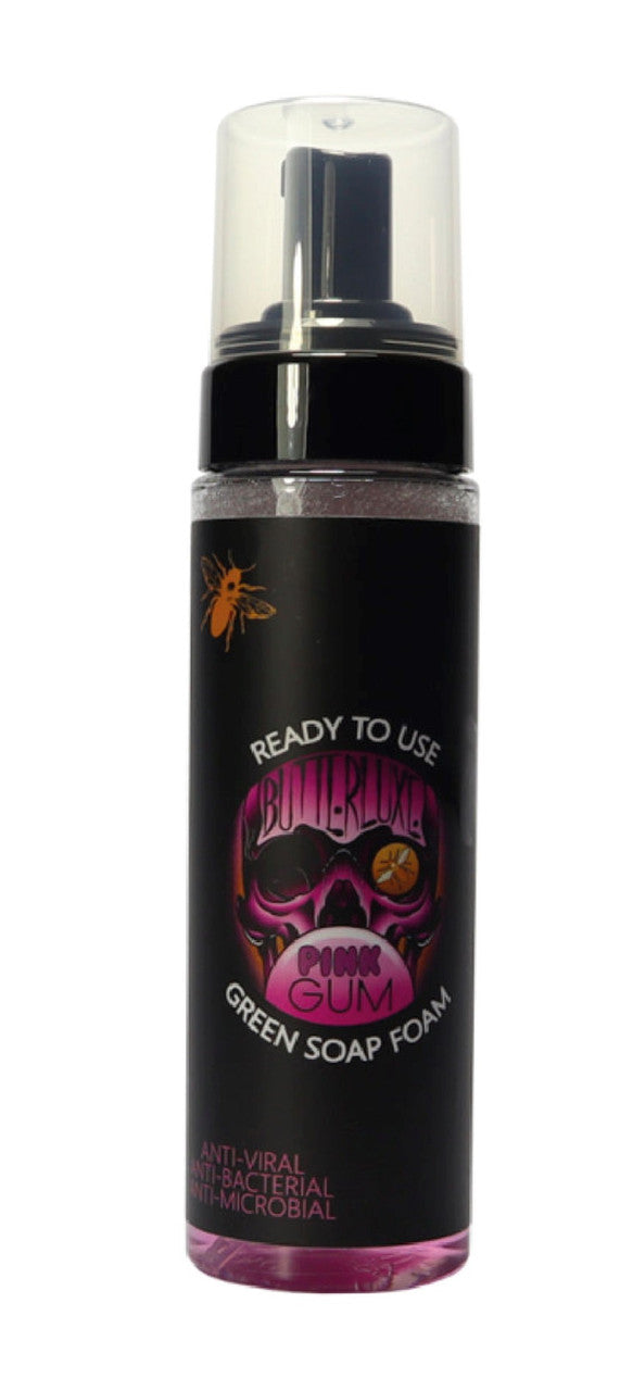 Butterluxe Ready To Use Green Soap Foam Packed with anti-bacterial and anti-inflammatory properties. Effectively removes excess ink whilst soothing the affected area. Contains Chlorhexidine, one of the worlds most effective disinfectants. Packed with Anti-Microbial Properties! 100% Natural Oil Based! Complies with BS EN 1276, BS EN 13697, BS EN 16615 (Keeping your local authority happy!) Shake well, use directly from bottle INGREDIENTS: Aqua, Lauramine Oxide, Glycerine, Chlorhexidine Digluconate 2% And Essential Oils. Manufactured under license, for safety data sheet contact: info@butterluxe.co.uk