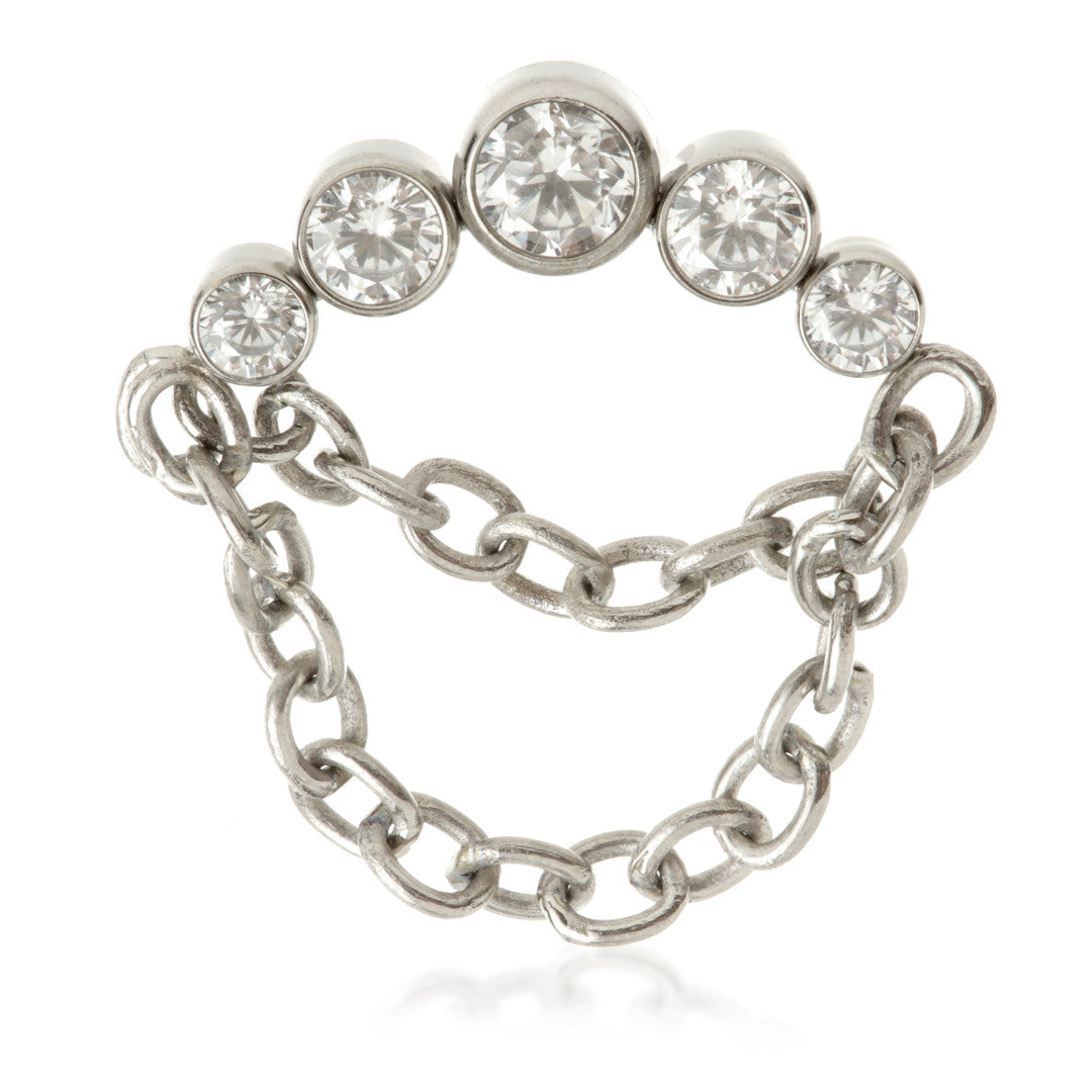 Titanium Internal Bezel Crescent with Double Hanging Chain Attachment Gauge: 1.2mm (0.9mm thread) Attachment Size: 6mm x 12mm Chain Length: 20+28mm Gem Sizes: 2*2.5*3*2.5*2mm Gem Colour: CR CZ Gem Stones Medical Grade Titanium 6Al-4VEli ASTM:F-136