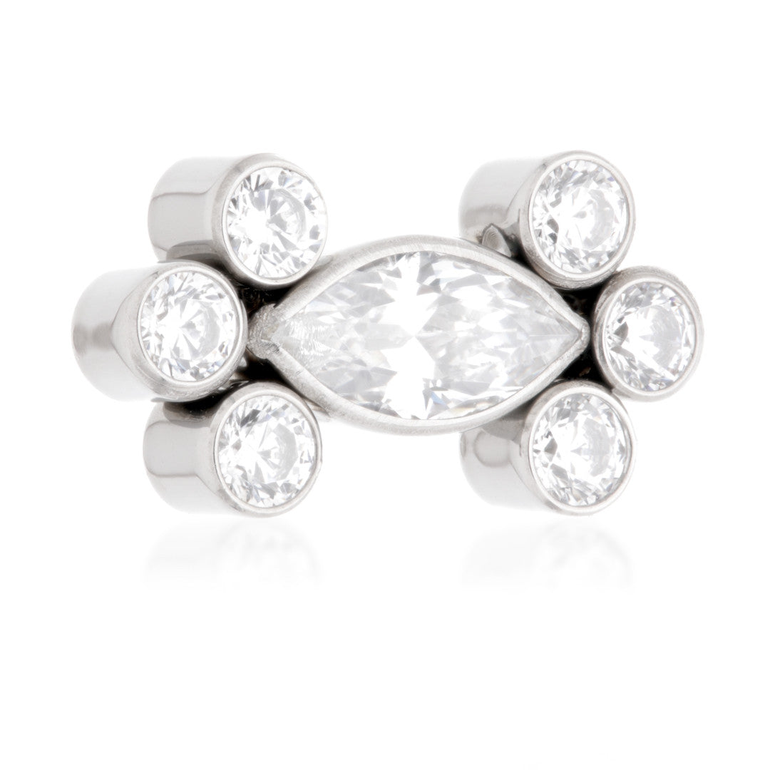 Titanium Internal Jewelled Bezel Marquise with Side Triple Bezel Attachment Gauge: 1.6mm (1.2mm thread)Size: 5*9.5mmGem Colour: CRCZ Gem Stones Medical Grade Titanium 6Al-4VEli ASTM:F-136