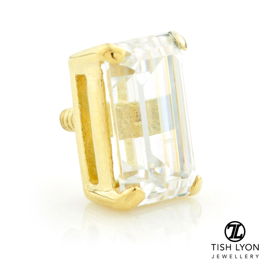 TISH LYON 18ct Yellow Gold Baguette Swarovski Gem Internal Thread Attachment - To fit TL18Q16-Base Size: 6mm x 3mm 0.8mm Thread / 1.2mm Bar (European Thread) Gold: Yellow Gem: Swarovski Crystal Fit Ti-Couture (iLabBase) 0.8mm thread Packaged in small grey presentation box Suitable for initial piercing