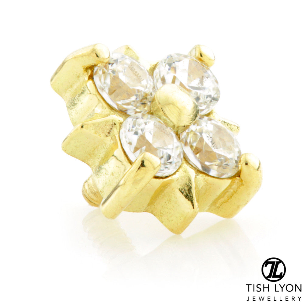 TISH LYON 18ct Yellow Gold Monagram Flower Swarovski Gem Internal Thread Attachment Size: 4mm x 4mm 0.8mm Thread / 1.2mm Bar (European Thread) Gold: Yellow Gem: Swarovski Crystal To fit TL18Q16-Base or Ti-Couture iLabBase 0.8mm thread Packaged in small grey presentation box Suitable for initial piercing