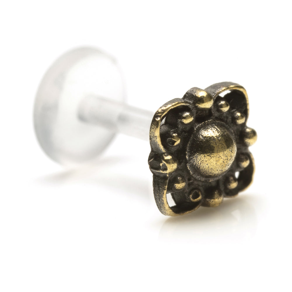 Ornate Brass Attachment on Plastic Labret - Internal push in Gauge: 1.2mm / 16g Length: 6mm or 8mm Attachment Size: 6mm (approx) Not for initial piercing, only to be worn in healed piercings