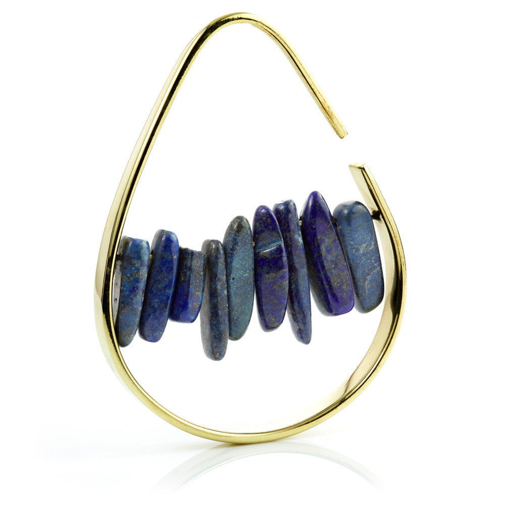 Lapis Lazuli Pieces on Brass Ear Circular Tear Hanging Weight Wear through tunnel or as earring Gauge: 2mm / 3mm / 4mm / 5mm / 6mm External Diameter: 65mm x 50mm Weight: 20gms (up to) Only to be worn in healed piercings