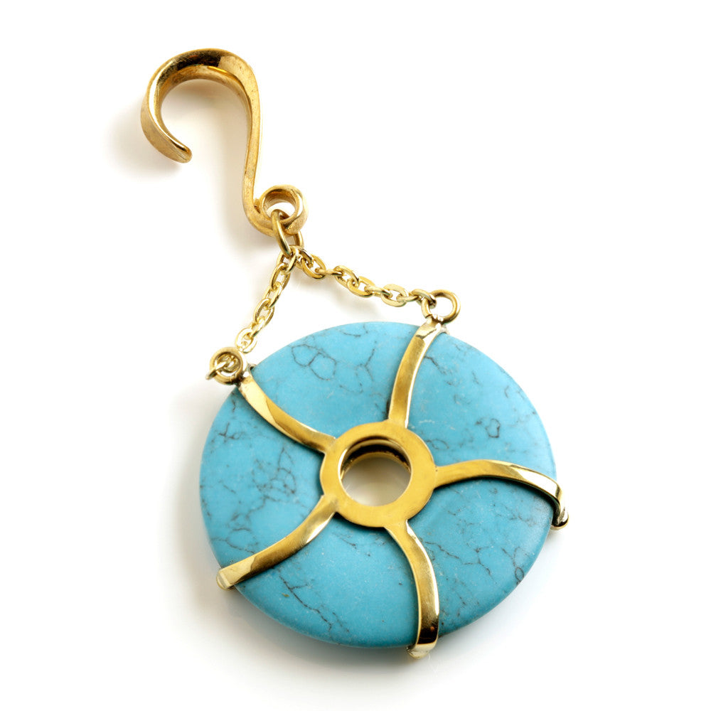 Turquoise (dyed Howlite) Pendent Brass Ear Weight Gauge: 6mm / 2ga Weight: 14.5gm Pendent Size: 40mm Some believe Turquoise can be worn for protection