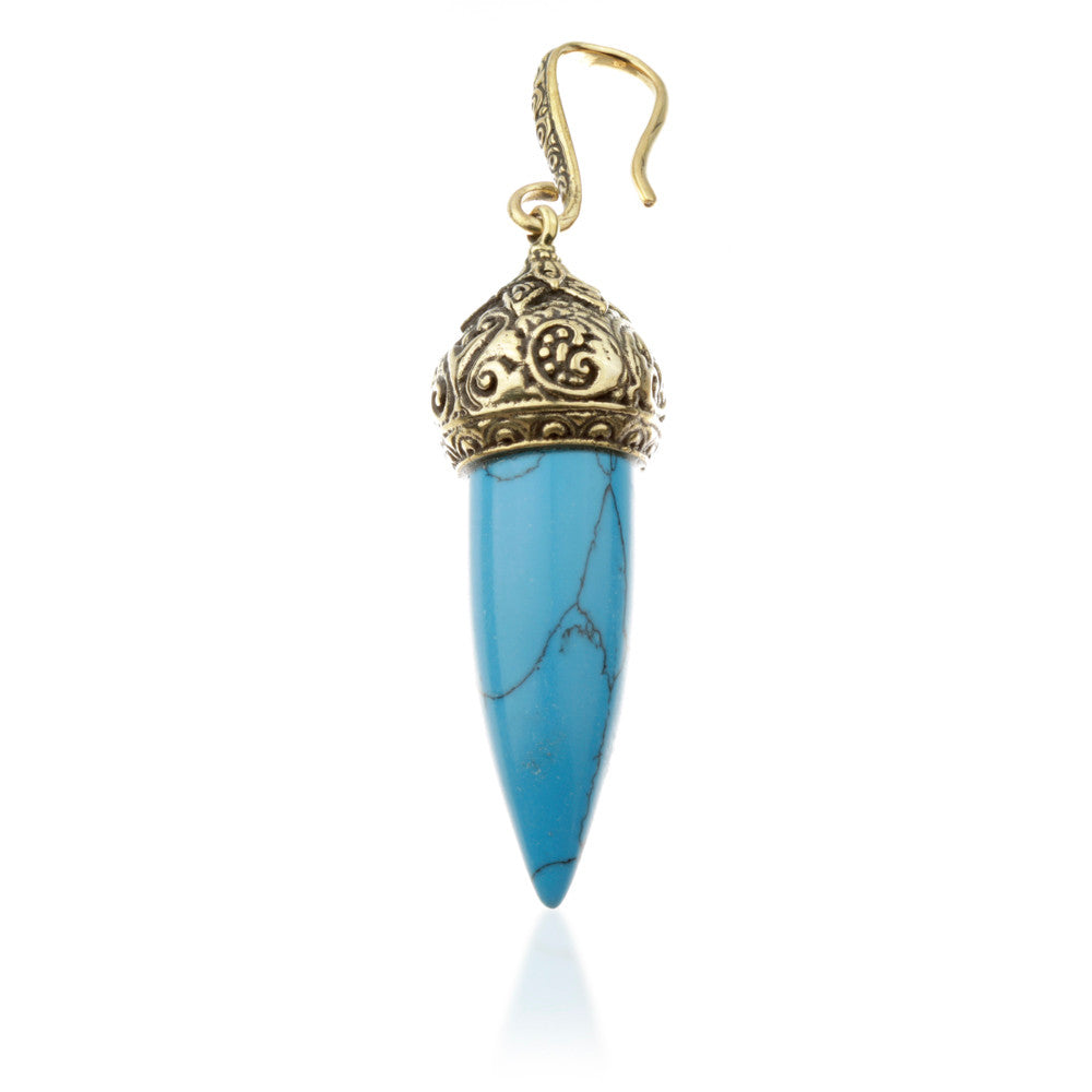 Turquoise (dyed howlite) Pendent Brass Hook Ear Weight Weight: 9.6gm Overall length: 53mm Approx Pendent Size: 35mm x 15mm Approx Some believe Turquoise can be worn for protection This is a natural piece of stone so size/shape vary