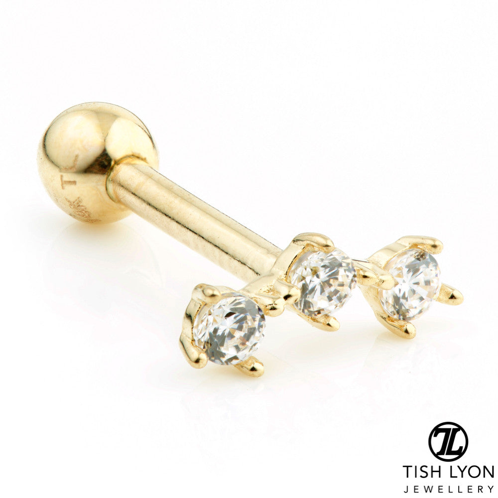 TISH LYON® 9ct or 14ct Gold Crecent 3 Claw Set Gem Micro Barbell Gem Bar: 18*2.5mm Gem Size: 2.5mm (x3) Size: 1mm x 6mm or 1.2mm x 6mm or 8mm Ball: 3mm Yellow or White Gold Laser Marked on Ball (not on bar) Packaged in small grey presentation box. 14ct Suitable for initial piercing.