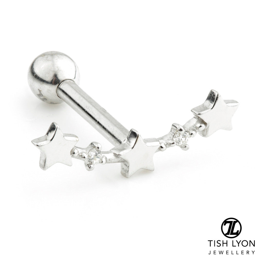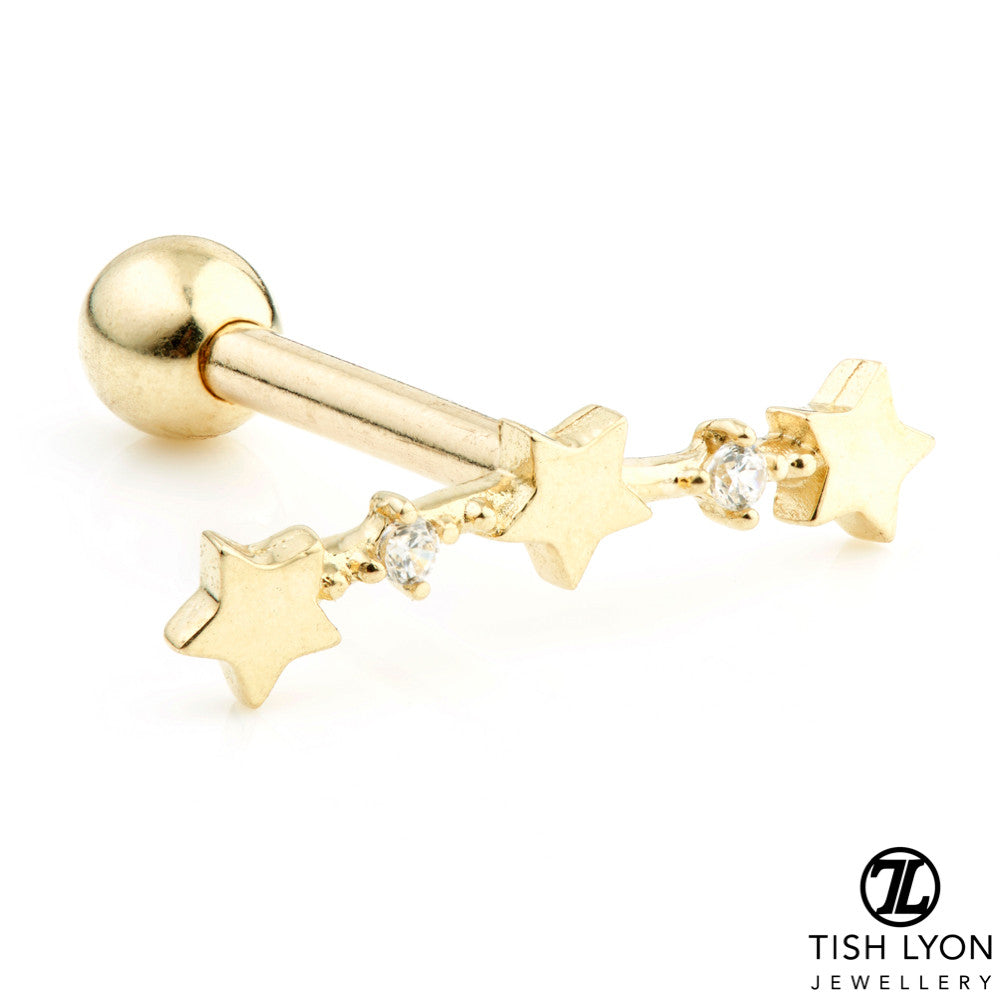 TISH LYON® 14ct Gold Crescent 2 Gem & 3 Star Micro Barbell Top Bar: 12*2mm Gem Size: 1mm (x2) Yellow or White Gold Barbell Length: 6mm or 8mm Gauge: 1mm or 1.2mm Ball: 3mm Laser Marked on Ball (not on bar) 14ct Suitable for initial piercing