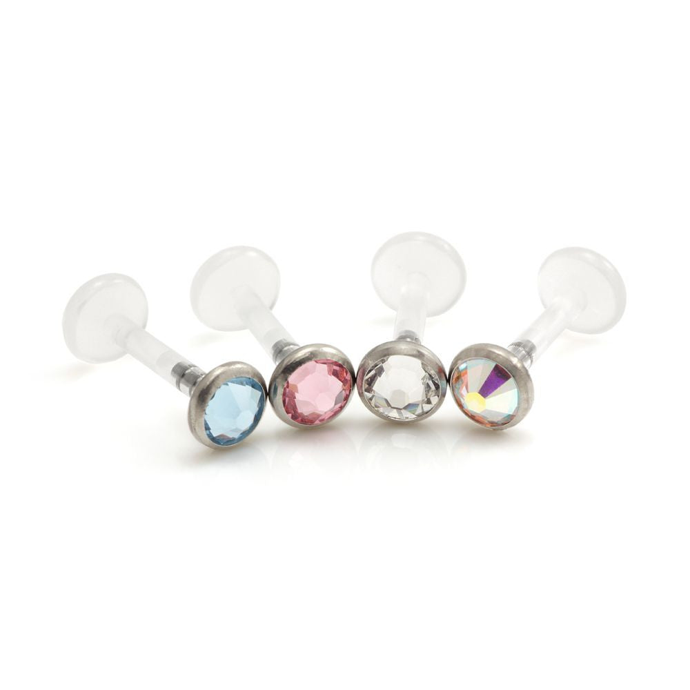Titanium Gem Disk on a 1.2mm Bioplast Labret Stem Push to close - turn and pull to open Gem Colours: Aqua/Crystal/Light Rose/AB Titanium can be coloured - HP, Blue, Lt Blue, Yellow, Pink, Purple, Green, Rainbow Can be autoclaved Length: 6mm, 7mm, 8mm and 10mm