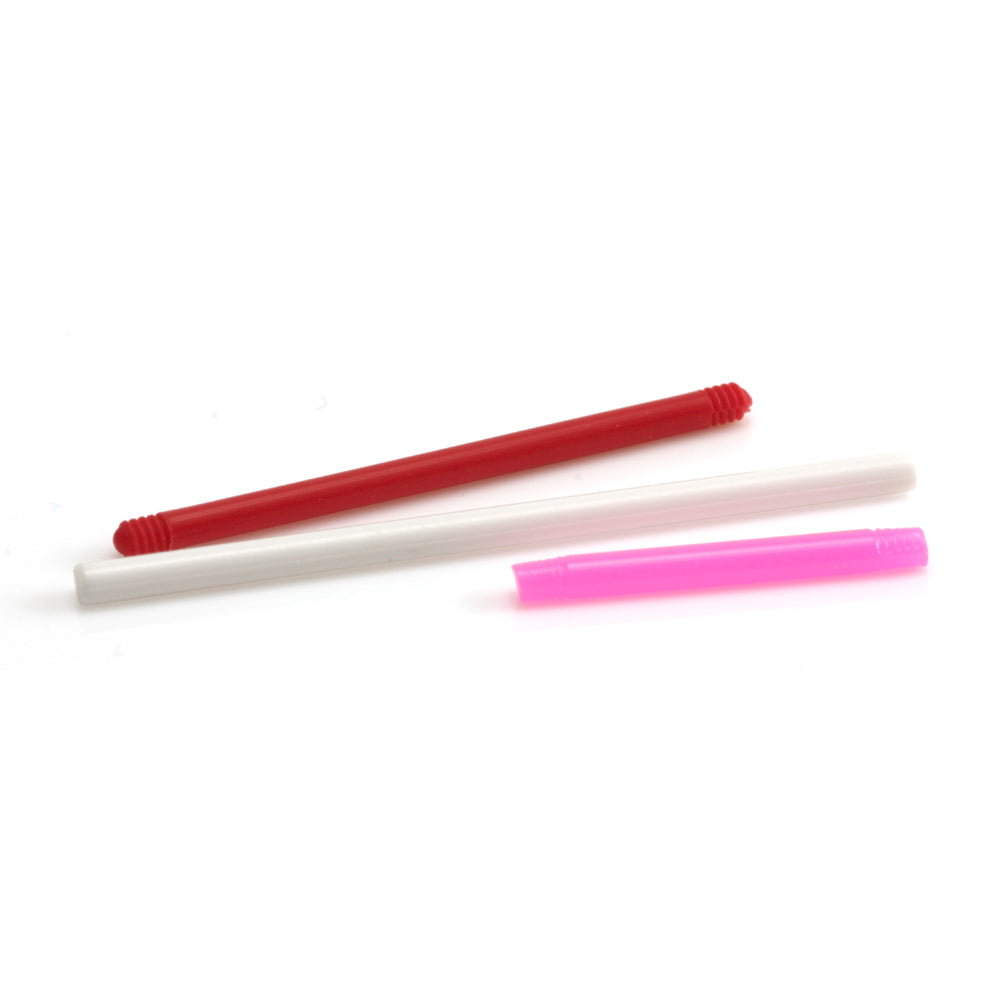 Bioplast Straight Barbell (balls sold separately) Can be cut to size. Can be used for initial piercing. Gauge: 1.2mm / 1.6mm Length: 6mm - 30mm Colours: Clear, White, Pink, Red