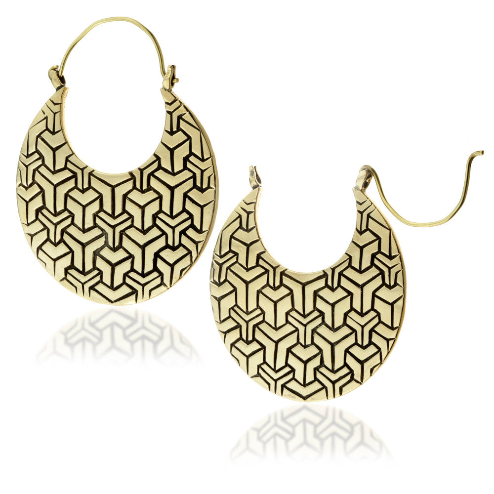 Brass Geometric Hoop Earrings (Pair) Wear through tunnel or as earring Gauge: 1mm / 18g External Diameter: 49mm Only to be worn in healed piercings