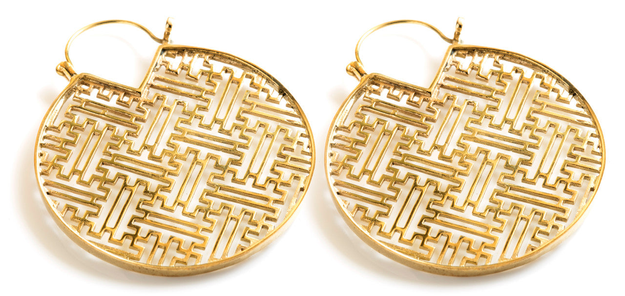 Large Round Geometric Brass Hoop Earrings (Pair) Wear through tunnel or as earring Gauge: 1mm / 18g Width: 52mm Length: 52mm Finish: Polished Only to be worn in healed piercings