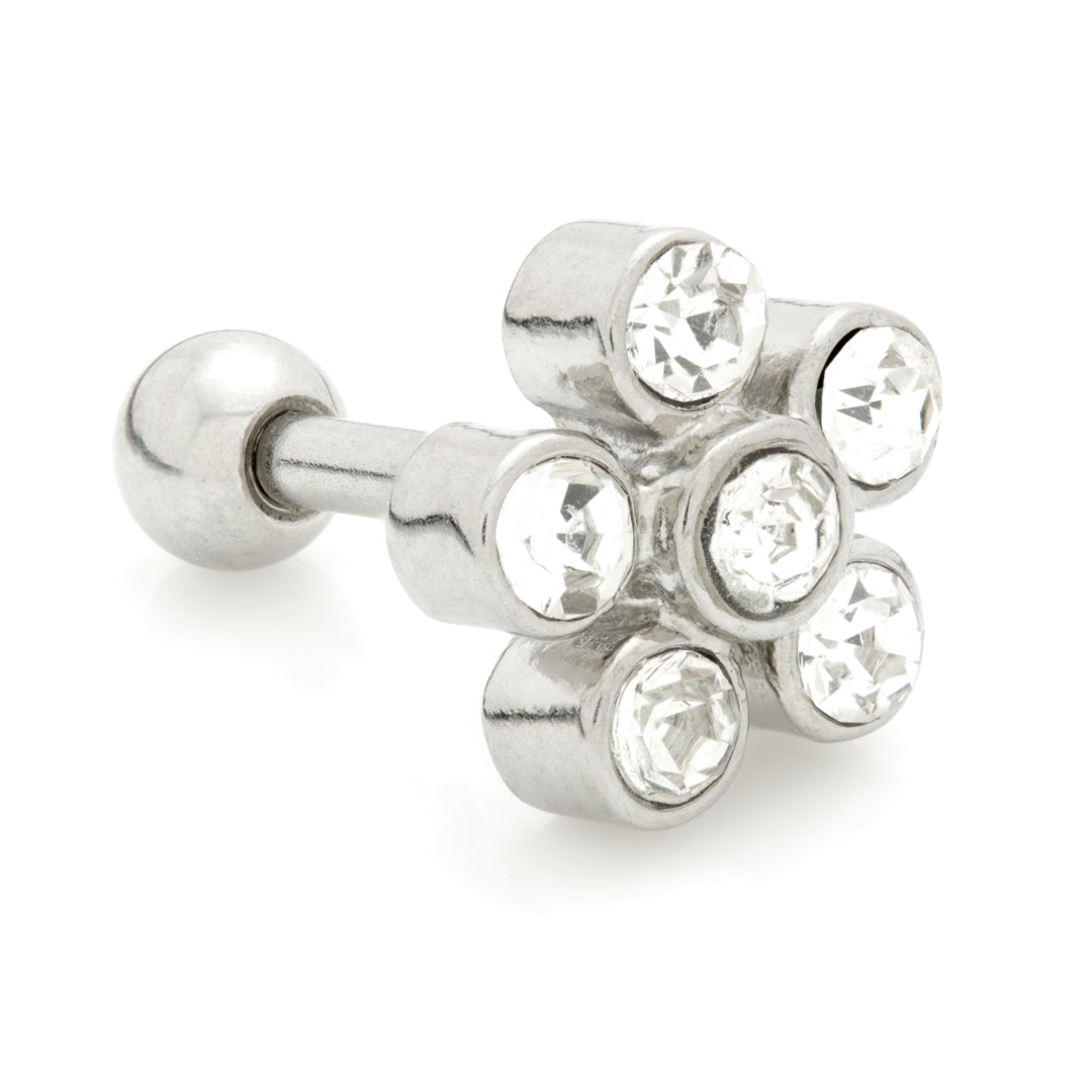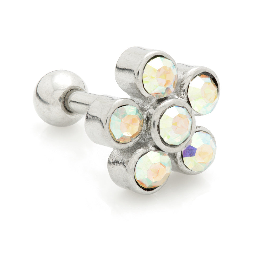 Flower Gem Bar - Detachable Cast Steel Gem Top Gauge: 1.2mm Sizes: 5mm Top Size: Large (approx 7mm) Gem Colour: Crystal, AB