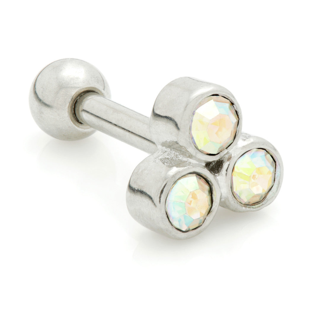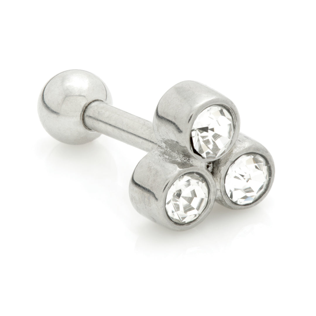 Triple Gem Bar - Detachable Cast Steel Gem Top Gauge: 1.2mm Sizes: 5mm Top Size: Small (approx 4mm), Medium (approx 5mm), Large (approx 6mm) Gem Colour: Crystal, AB