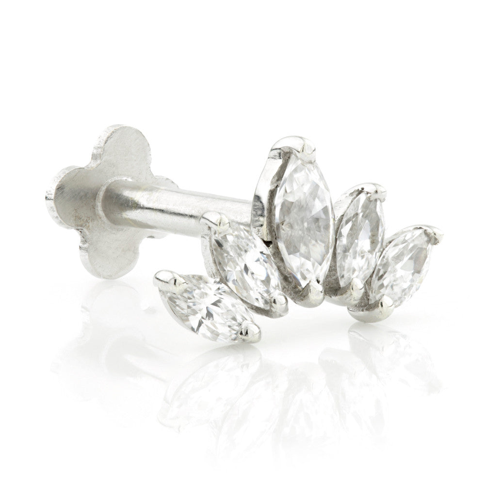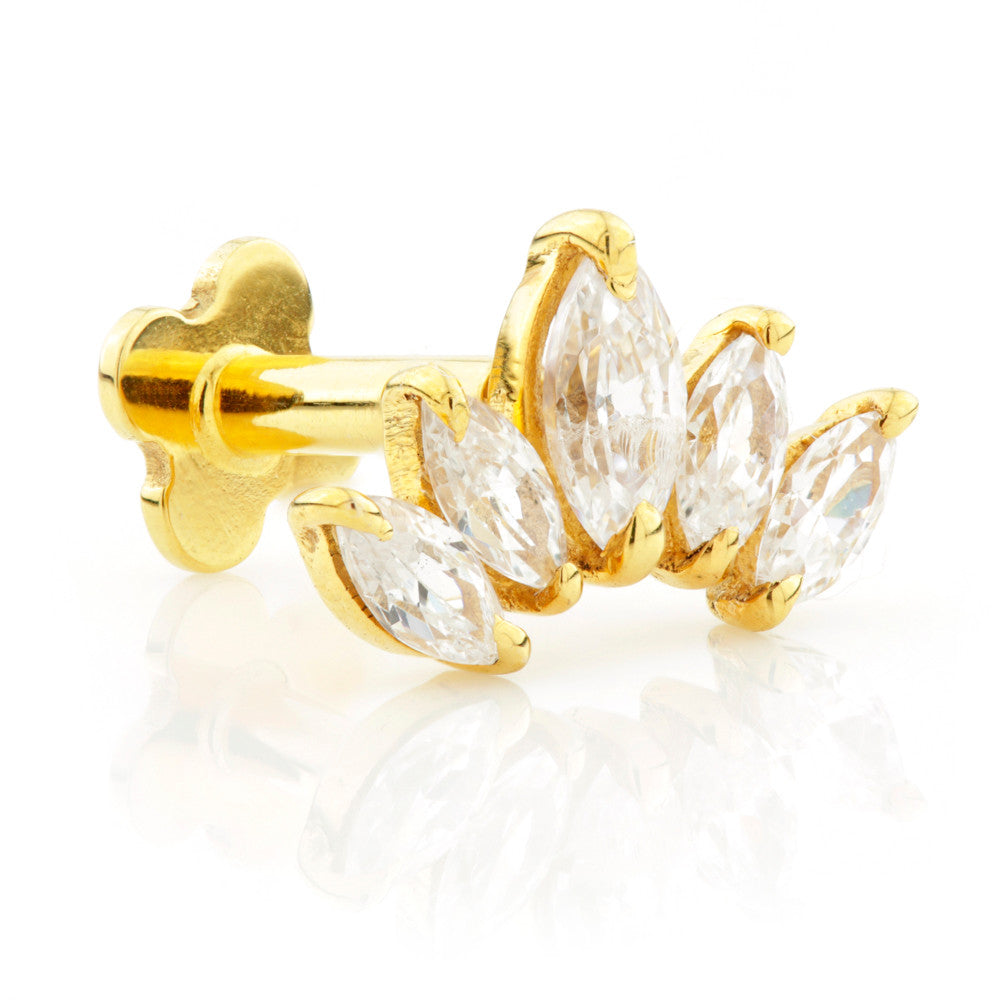 TISH LYON® 9ct or 14ct Gold Crescent Marquise Labret Sizes: 1.2mm x 6mm or 8mm Monagram Flower Base Plate: 5*2mm Gold: Yellow or White Weight: 0.36gm - 0.38gms 14ct Suitable for initial piercing
