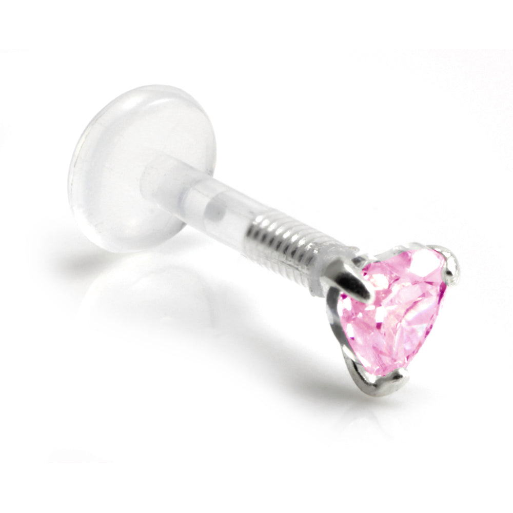 Gem Heart Set in 925 Silver on a 1.2mm Bioplast Labret Stem Silver top unsuitable for autoclaving Push to close - turn and pull to open Gem Colours: Crystal or Light Rose Size: 6mm, 8mm or 10mm