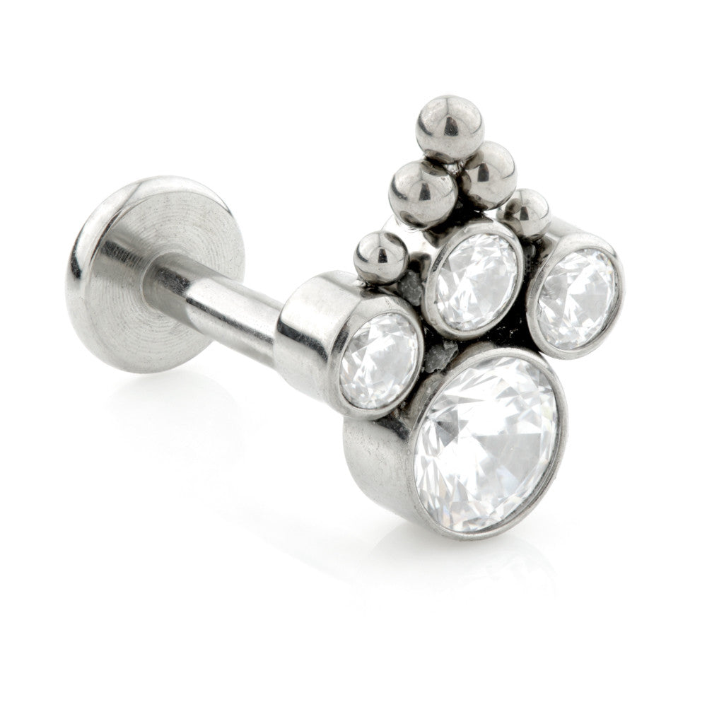 Internal Ti Micro Labret With 4 Gem Discs and 5 small dot balls Gauge: 1.2mm (0.9mm thread) Size: 8mm Gem Colour: Crystal Fits US Thread Medical Grade Titanium 6Al-4VEli ASTM:F-136