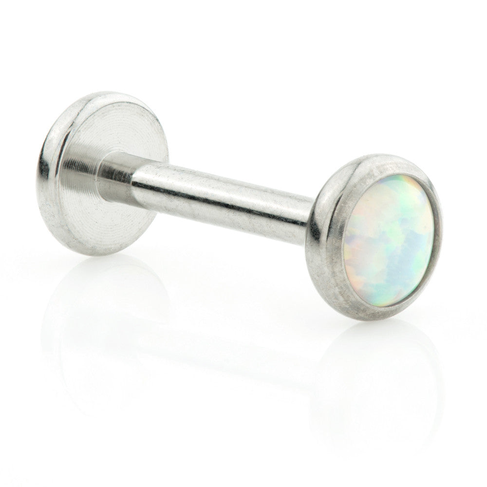 Titanium Labret with White Opal Disk Gauge: 1.2mm (thread on Disk 0.9mm) Labret Size: 8mm Disk Size: 4mm Medical Grade Titanium 6Al-4VEli ASTM:F-136