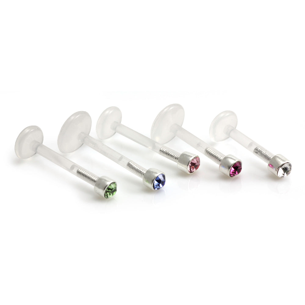 Gem Stud Set in 925 Silver on a 1.6mm Bio Plast Labret Stem. 3mm multi-faceted gem ball (silver top unsuitable for autoclaving). Push to close - turn and pull to open. Gem Colours: Aqua/Amethyst/Blue Zircon/Crystal/Fuchsia/Light Rose/Lt Siam/Sapphire/Peridot Length: 6mm, 8mm and 10mm