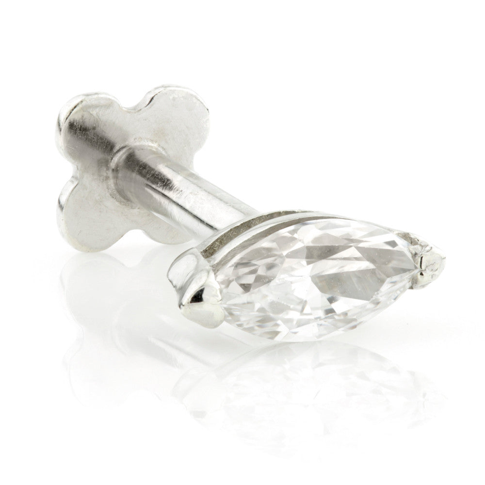 TISH LYON® 9ct or 14ct Gold Marquise Labret Sizes: 1.2mm x 6mm or 8mm Monagram Flower Base Plate: 5*2mm Gold: Yellow or White Weight: 0.29gm - 0.3gms 14ct Suitable for initial piercing