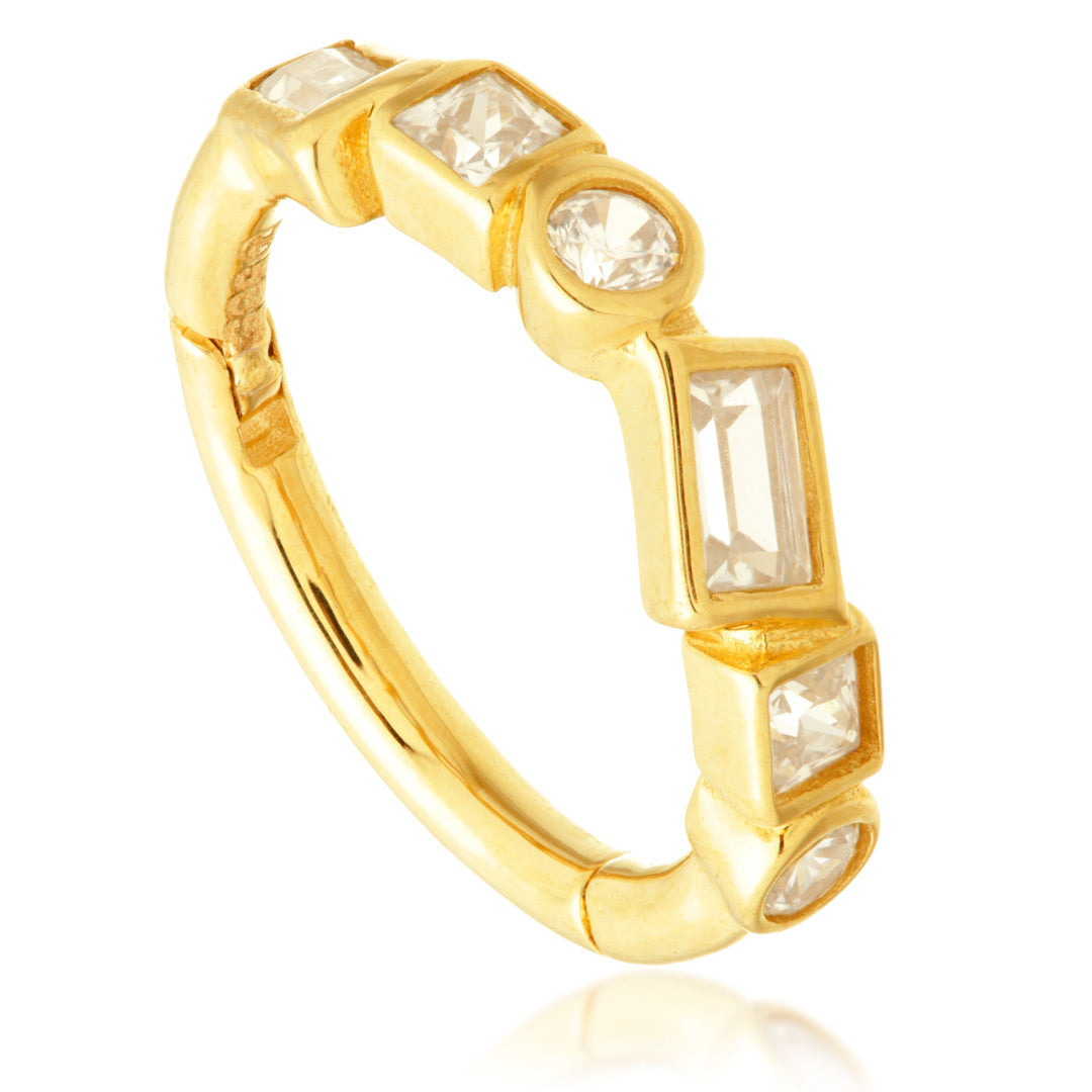 Solid Gold Multi Shaped Jewelled Hinge Ring Cubic zirconia gemstonesAvailable in solid 9ct or 14ct gold, and white goldGauge: 1.2mm Size: 6mm Gem Size: 1.5/1.5*1.5/2.5*1.5mm