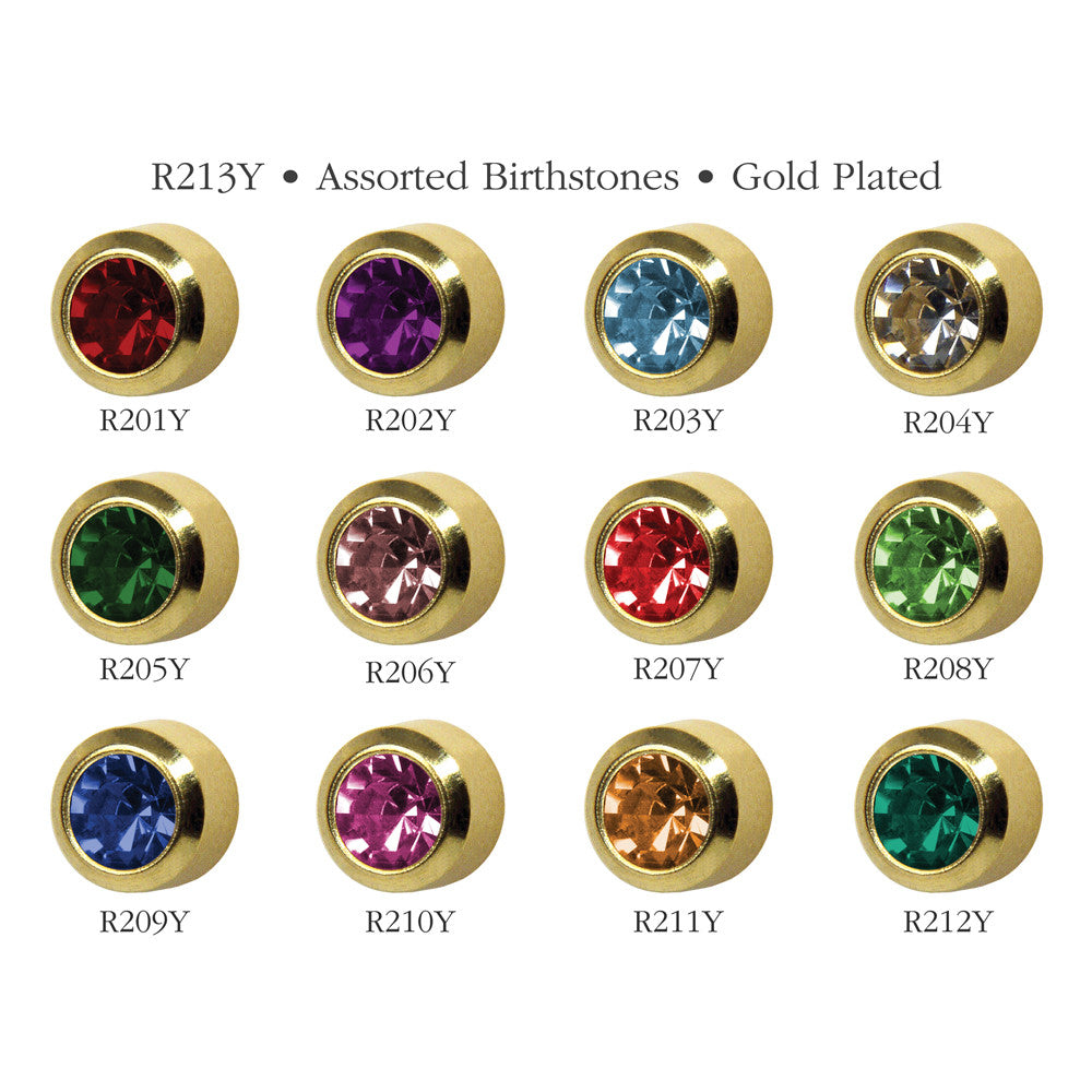 Regular Size Assorted Gold Piercing Studs - 12 per pack January to December Birthstones - 1 of each colour Gold Plate All Sterile and EC compliant Studex Code: DCNR213Y