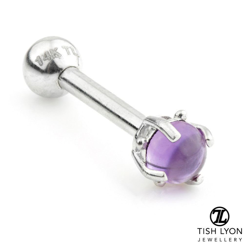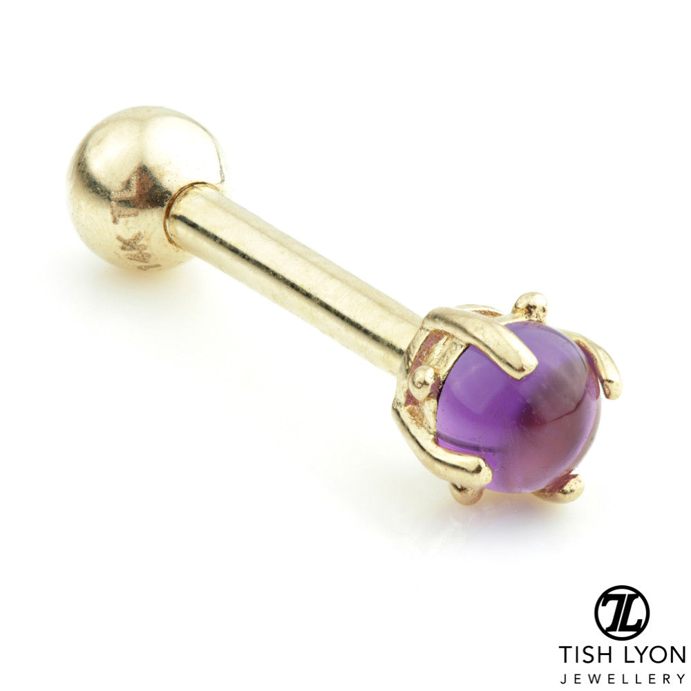 TISH LYON® Gold Prong Amethyst Microbar 14ct Yellow or White Gold Cartilage Ear Bar Amethyst Semi Precious Stone Sizes: 1.2mm x 6mm or 8mm (3mm ball) Laser Mark - 14K TL (on ball not on bar) Suitable for initial piercing (autoclave on coolest heat)