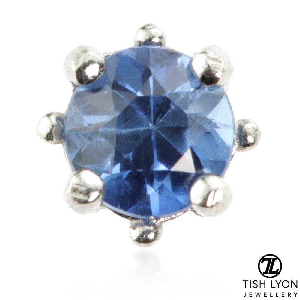 TISH LYON® Gold Prong Sapphire Microbar 14ct White Gold Cartilage Ear Bar Blue Sapphire: 3mm approx Sizes: 1.2mm x 6mm or 8mm (3mm ball) Laser Mark - 14K TL (on ball not on bar) Suitable for initial piercing (autoclave on coolest heat)