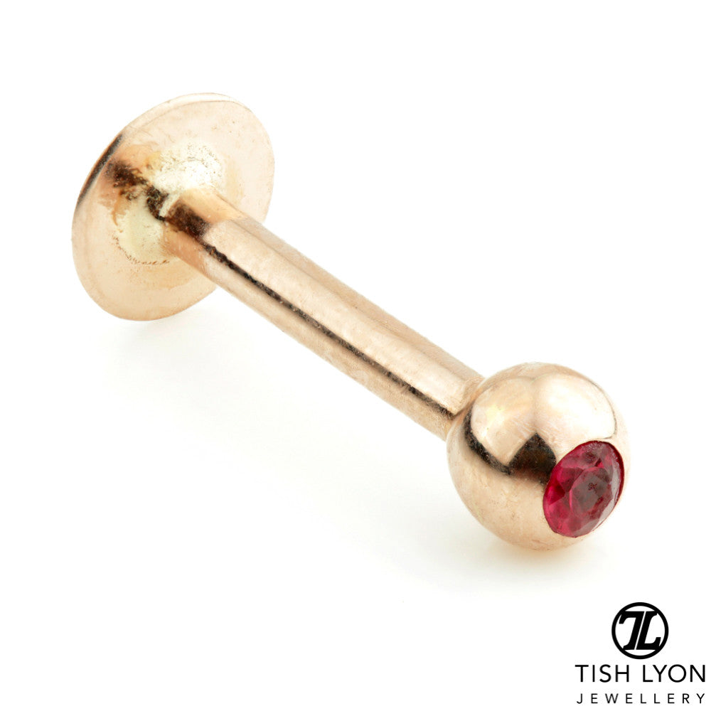TISH LYON® 14ct Gold Ruby Gem Micro Labret Ruby / Grade: A (Natural Stone) - Facet Cut 1.5mm Sizes: 1.2mm x 6/8mm Ball Size: 3mm Gold: Yellow, White or Rose Suitable for initial piercing (autoclave on coolest heat) Laser Mark - 14K TL