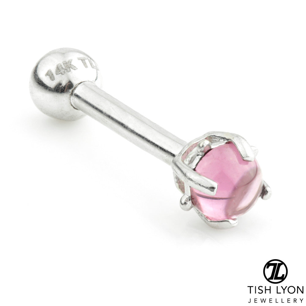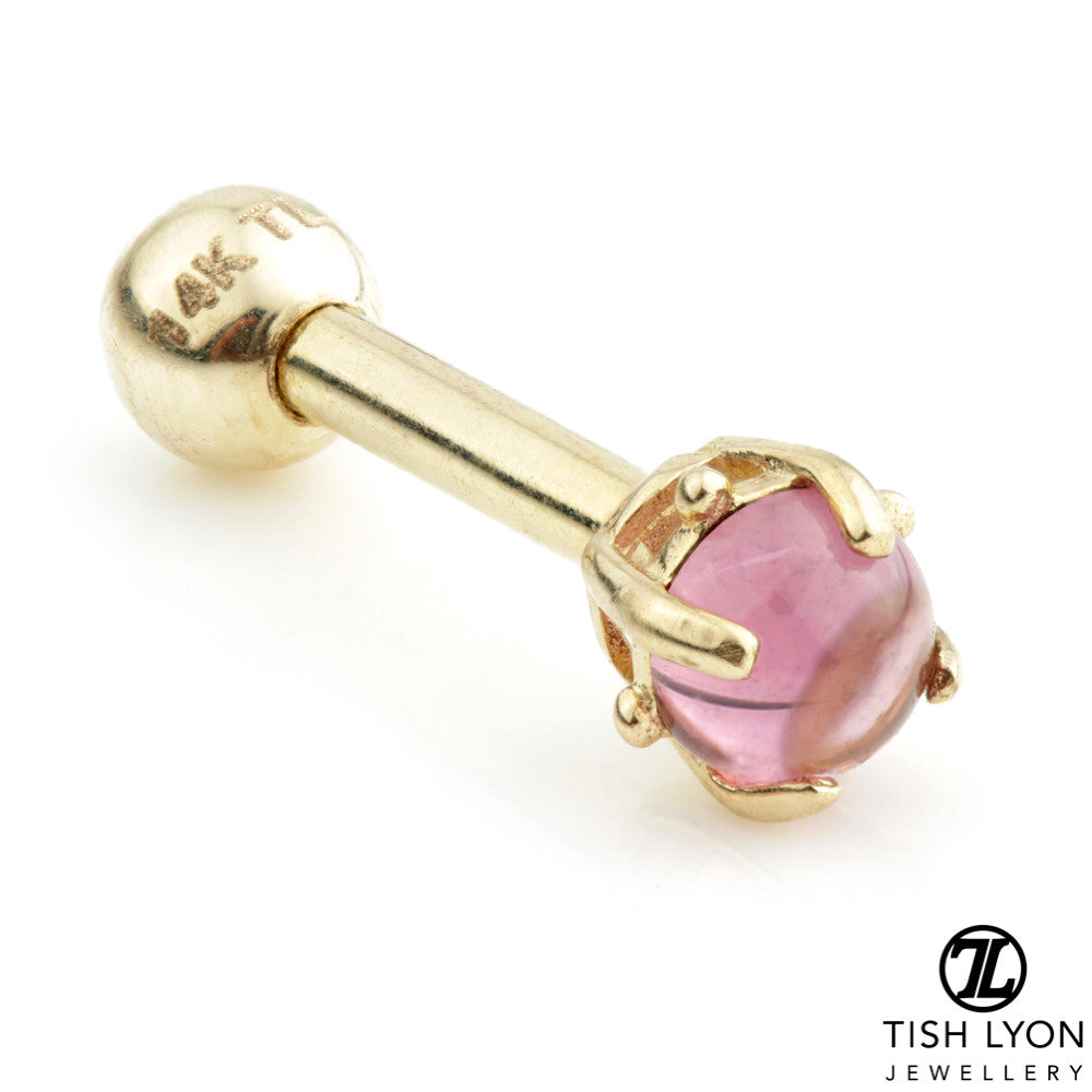 TISH LYON® Gold Prong Rhodolite Microbar 14ct Yellow or White Gold Cartilage Ear Bar Rhodolite Garnet - Raspberry-Pink Semi Precious Stone Sizes: 1.2mm x 6mm or 8mm (3mm ball) Laser Mark - 14K TL (on ball not on bar) Suitable for initial piercing (autoclave on coolest heat)
