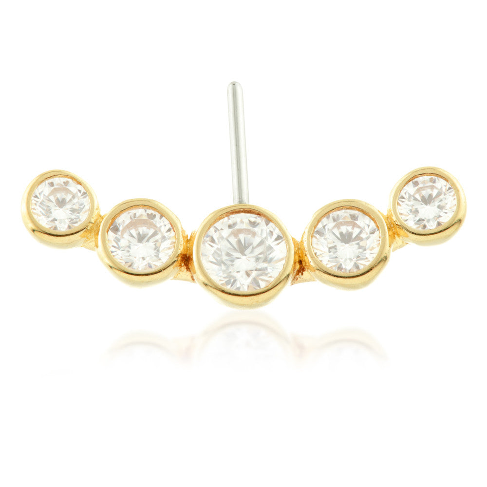 TISH LYON® - 14ct Threadless Gold Front Facing Bezel Gem Crescent Pin Attachment - Small Gauge: 1.2mm Size: 3mm x 13mm Gem Sizes: 3/2.5/2mm Gold Colour: Yellow Gem Colour: Crystal 316L Surgical Steel Pin Packaged in small grey presentation box/card Suitable for initial piercing