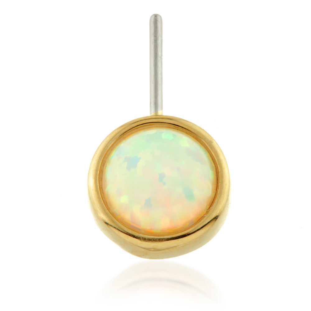 TISH LYON® - 14ct Threadless Gold Front Facing Bezel Opal Pin Attachment Gauge: 1.2mm Size: 5mm Gold Colour: Yellow Opal Colour: White 316L Surgical Steel Pin Packaged in small grey presentation box/card Suitable for initial piercing