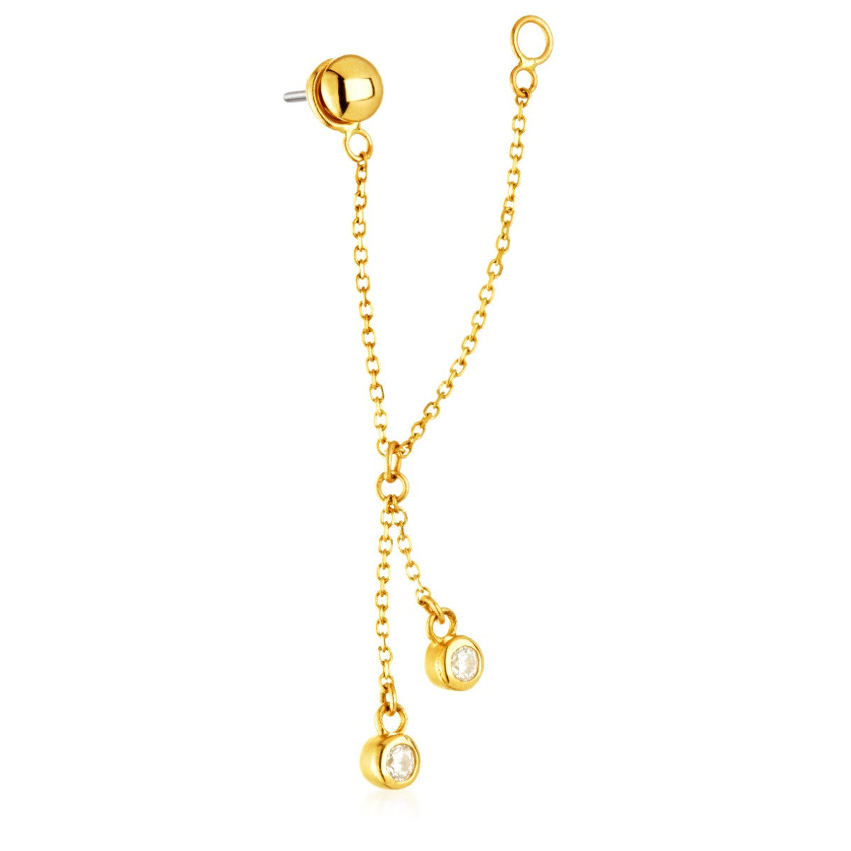 TL - 14ct Threadless Gold Pin Attachment With Double Bezel Hanging Chain Gauge: 1.2mm Gold Colour: Yellow Gem Colour: CR CZ Gem Stones 14ct Solid Gold Top on 316L Surgical Steel Pin Packaged in small grey presentation box/card Suitable for initial piercing