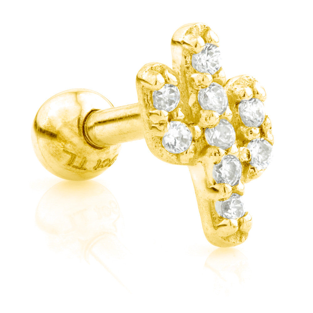 TISH LYON® Gold CZ Cactus Microbar 9ct or 14ct Gold Cartilage Ear Bar Colour: Yellow or White CZ Size: 1mm x 9 Cactus Size: 7mm x 10mm Sizes: 1.2mm x 8mm (3mm hex) Laser Mark 14ct Suitable for initial piercing