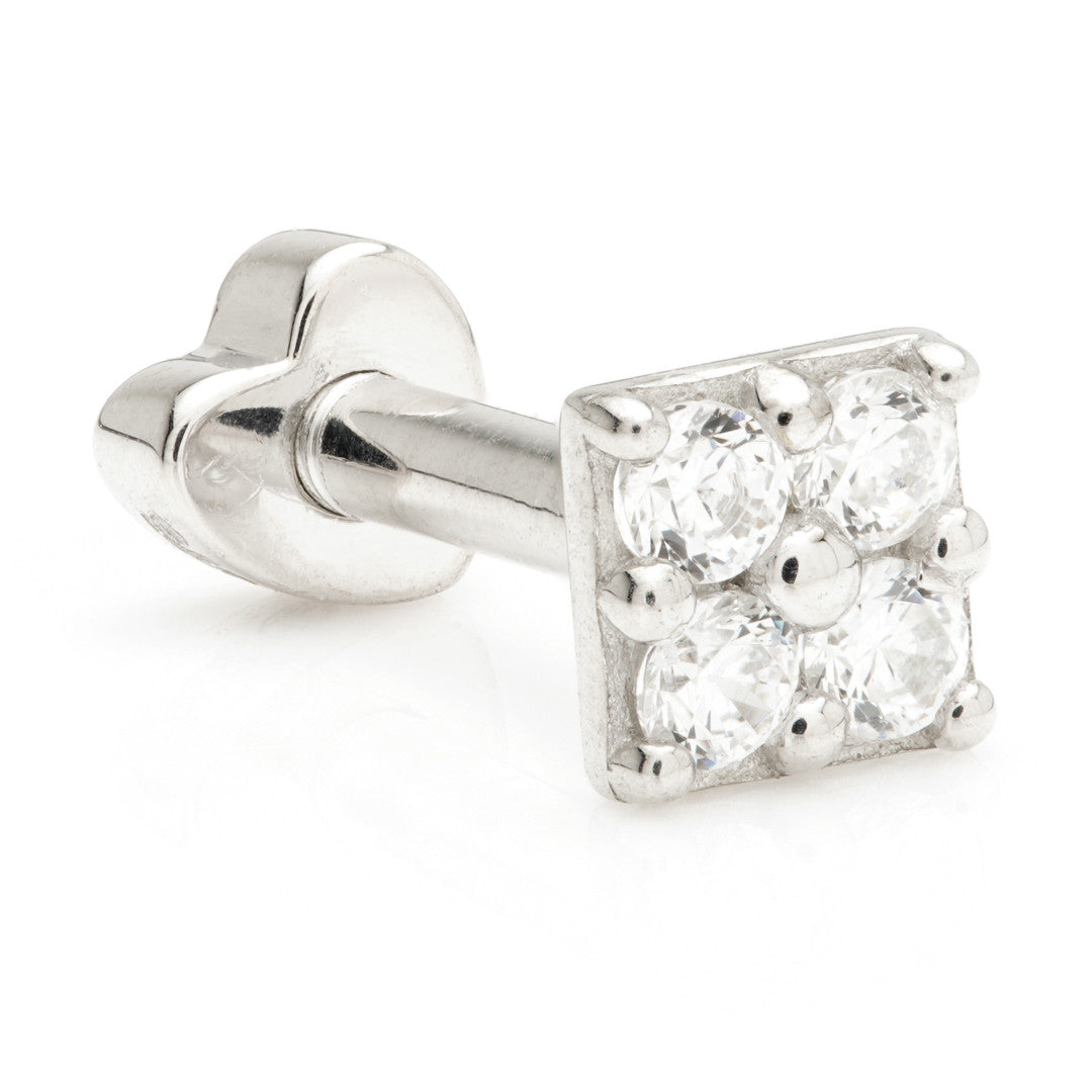 TISH LYON® 9ct External Threaded Microbar with Fixed Quad Gem Square and Screw on Heart Back Gauge: 1.2mm Bar Size: 6mm / 8mm Attachment Size: 4mm Gold Colour: W / Y Gem Colour: CR CZ Gem Stones