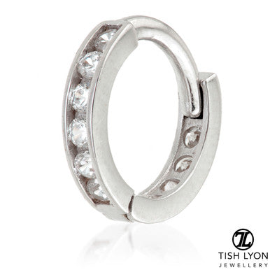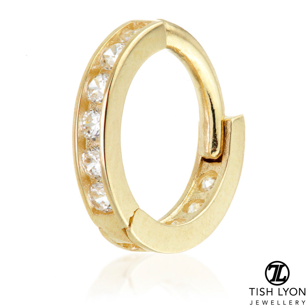 TISH LYON - Channel Set Gems Hinge RingContinuous Gem Surround 9ct or 14ct Yellow or White GoldCZ Crystal GemsSize: 0.8mm or 1.2mm x 8mmFor Nose, Cartilage, Tragus, Daith, etc 14ct Suitable for initial piercing