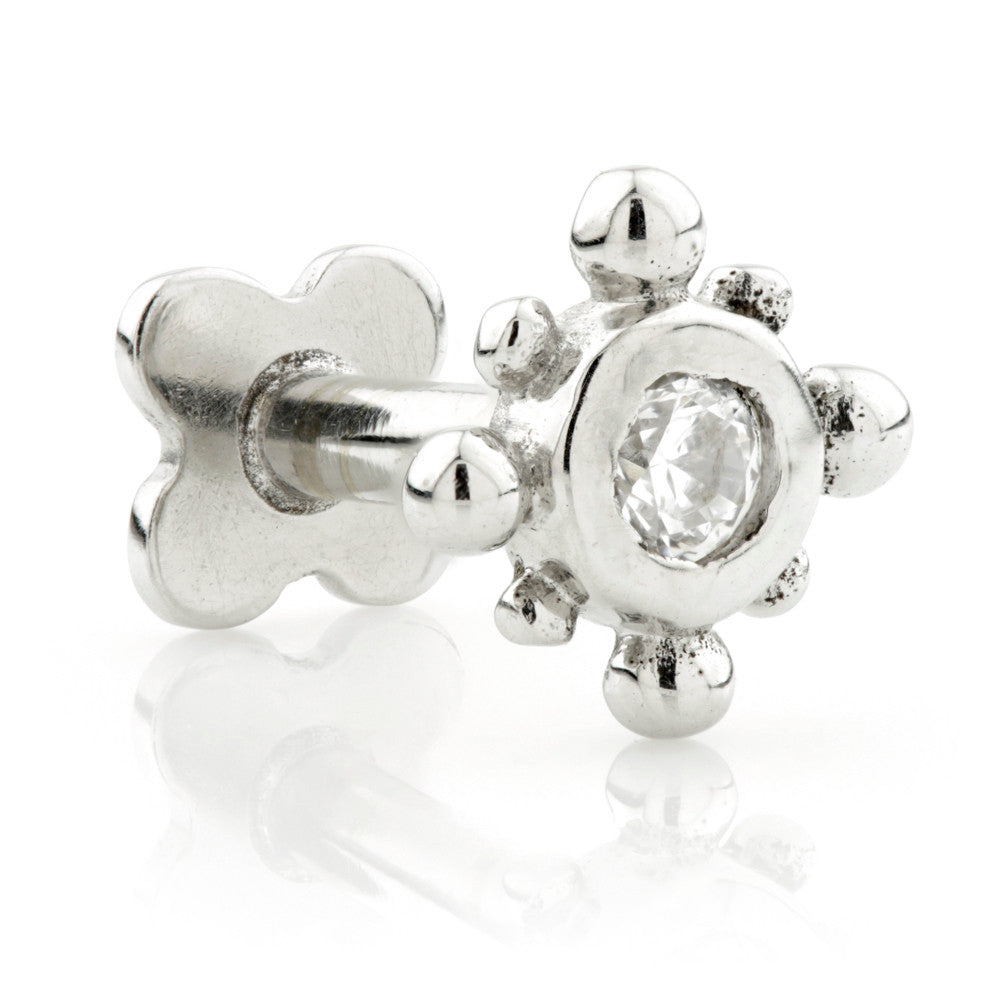 TISH LYON® 9ct or 14ct Gold Gem Dot Labret Sizes: 1.2mm x 6mm or 8mm Monagram Flower Base Plate: 5*2mm Gold: Yellow or White Weight: 0.3gm - 0.35gms 14ct Suitable for initial piercing