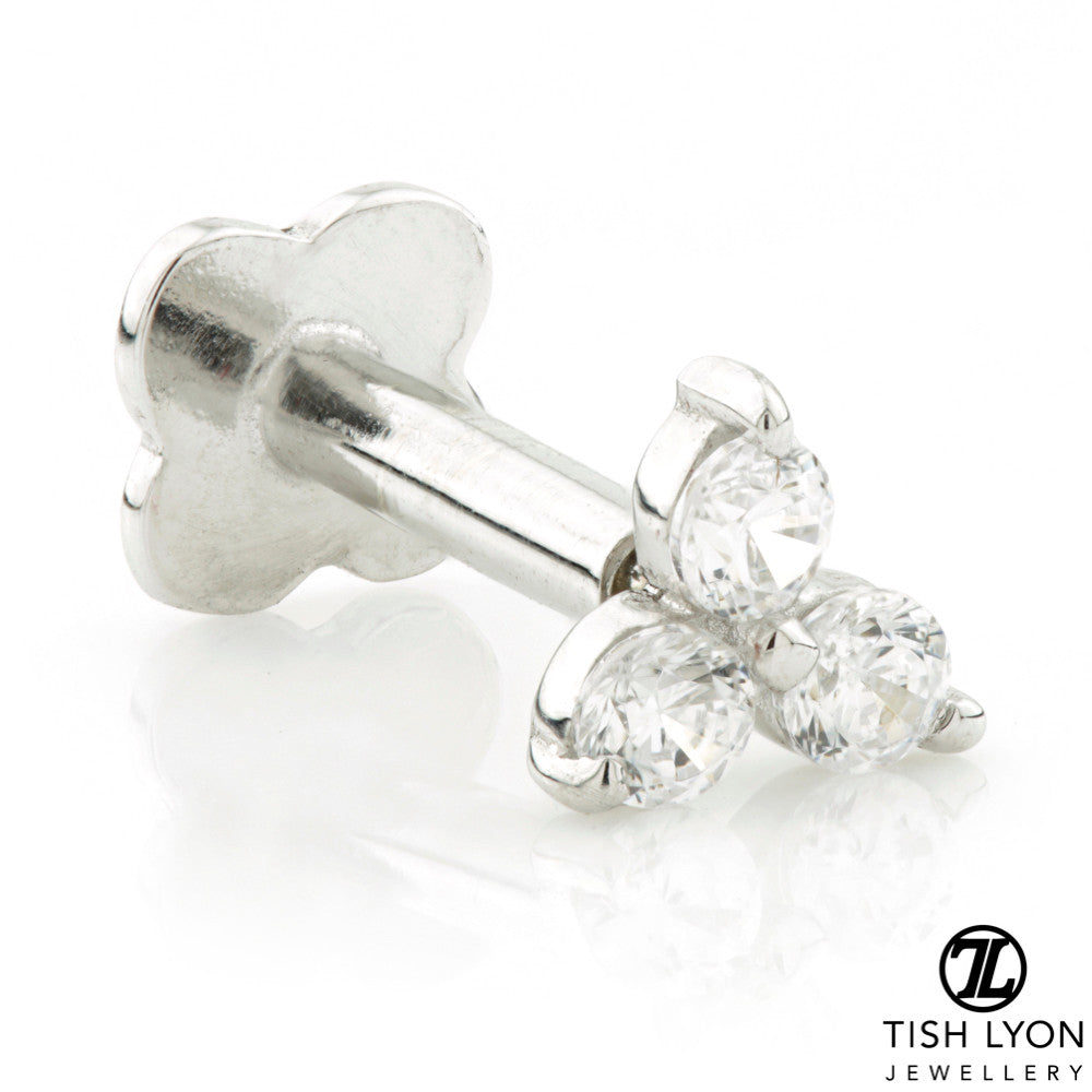 TISH LYON® 9ct or 14ct Gold Gem Trinity Labret Sizes: 1.2mm x 6mm or 8mm Monagram Flower Base Plate: 5*2mm Gold: Yellow or White Weight:0.23gm - 0.27gms