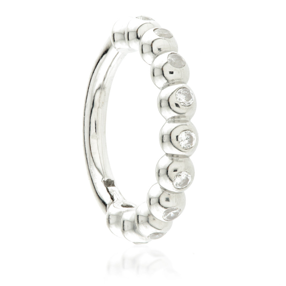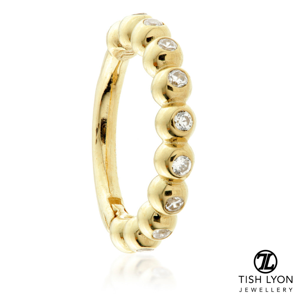 TISH LYON® - Hinge Bubble Ring with CZ Gems 9ct or 14ct Yellow or White Gold Segment Ring Size: 1.2mm x 8mm Weight: 0.66gms For Septum, Cartilage, Tragus, etc 14ct Suitable for initial piercing