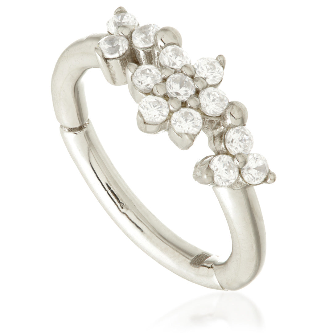 TISH LYON® - Gold Jewelled Flower With Double Trinity Hinge Ring 9ct or 14ct Gold Colour: Yellow or White Gauge: 1.2mm Size: 6mm or 8mm Gem Size: 1.1mm Gem Colour: CR CZ Gem Stone