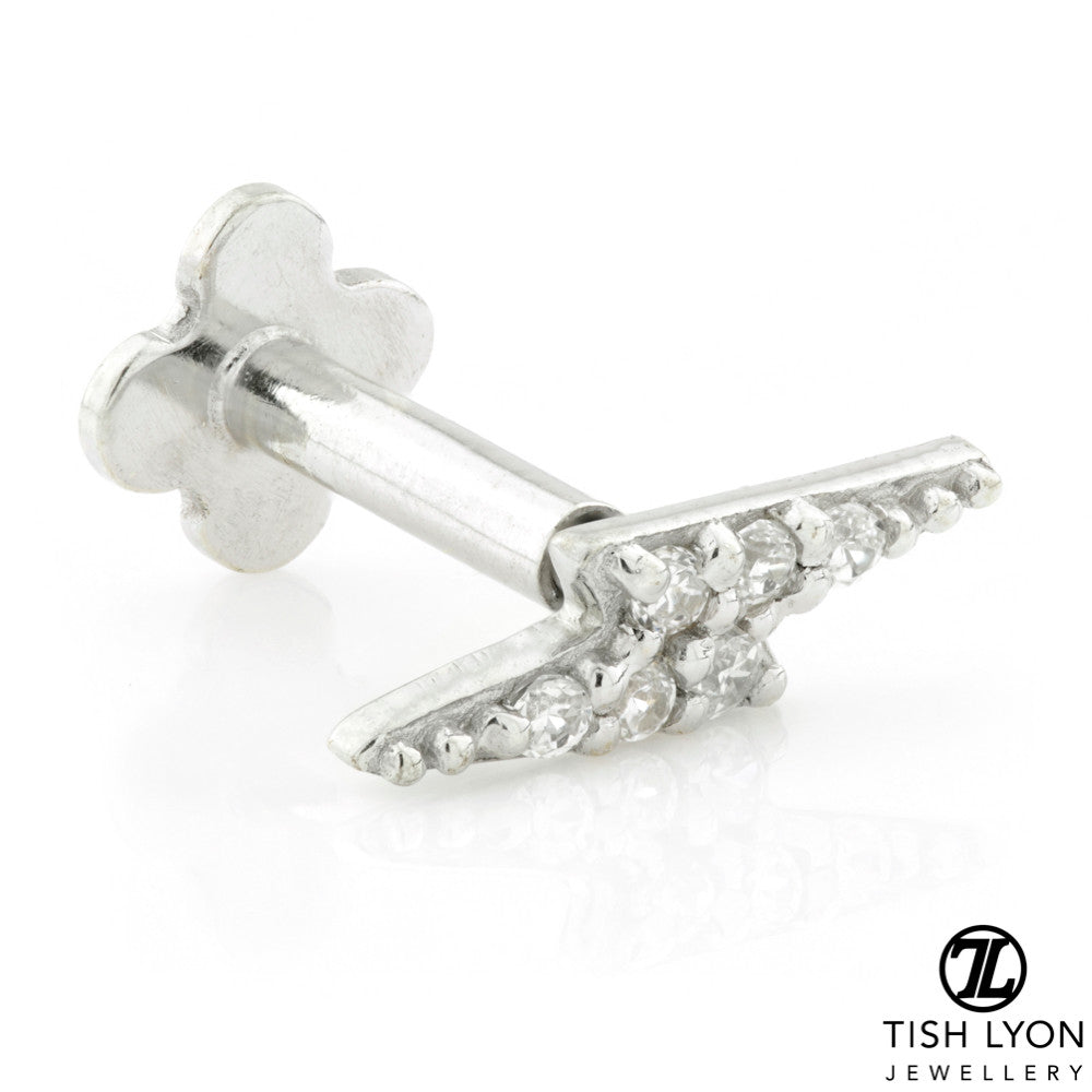 TISH LYON® 9ct or 14ct Gold Jewelled Lightning Bolt Labret Sizes: 1.2mm x 6mm or 8mm Monagram Flower Base Plate: 5*2mm Gold: Yellow or White Weight: 0.22gm - 0.25gms 14ct Suitable for initial piercing