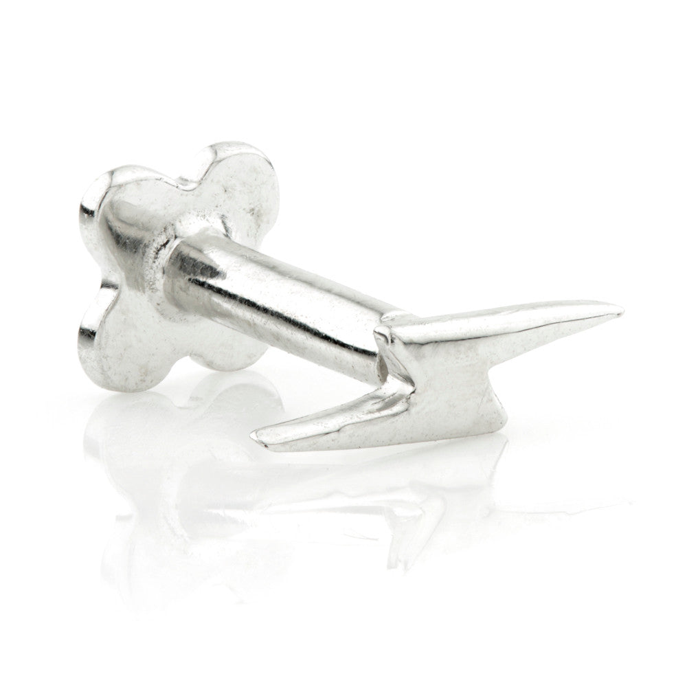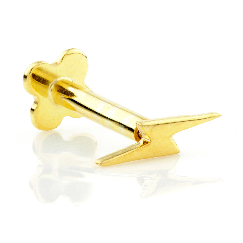 TISH LYON® 9ct or 14ct Gold Lightning Bolt Labret Sizes: 1.2mm x 6mm or 8mm Monagram Flower Base Plate: 5*2mm Gold: Yellow or White Weight:0.19gm - 0.21gms 14ct Suitable for initial piercing
