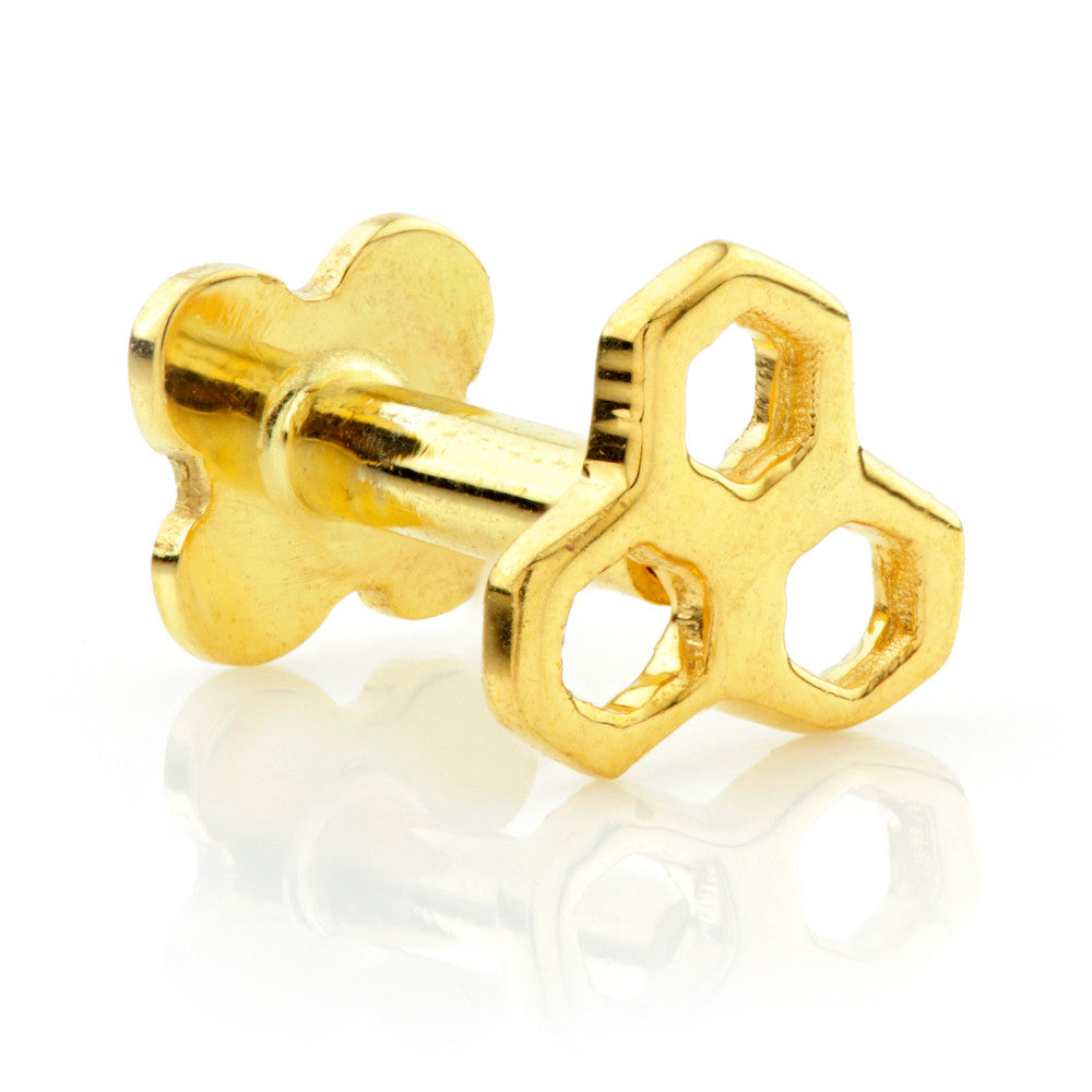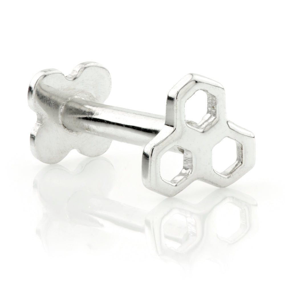 TISH LYON® 9ct or 14ct Gold Open Honeycomb Labret Sizes: 1.2mm x 6mm or 8mm Monagram Flower Base Plate: 5*2mm Gold: Yellow or White Weight:0.21gm - 0.24gms 14ct Suitable for initial piercing