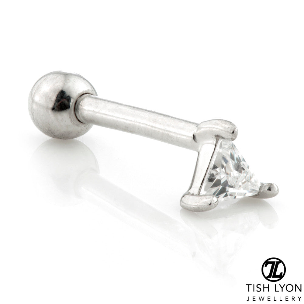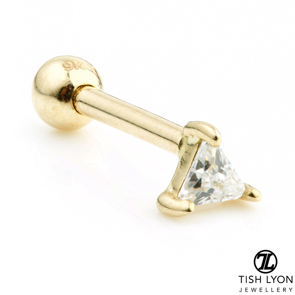 TISH LYON® 14ct Gold Prong Set Triangle Gem Micro Barbell Triangle Gem Size: 5mm Yellow or White Gold Size: 1mm or 1.2mm x 6mm or 8mm Ball: 3mm Laser Marked on Ball (not on bar) 14ct Suitable for initial piercing