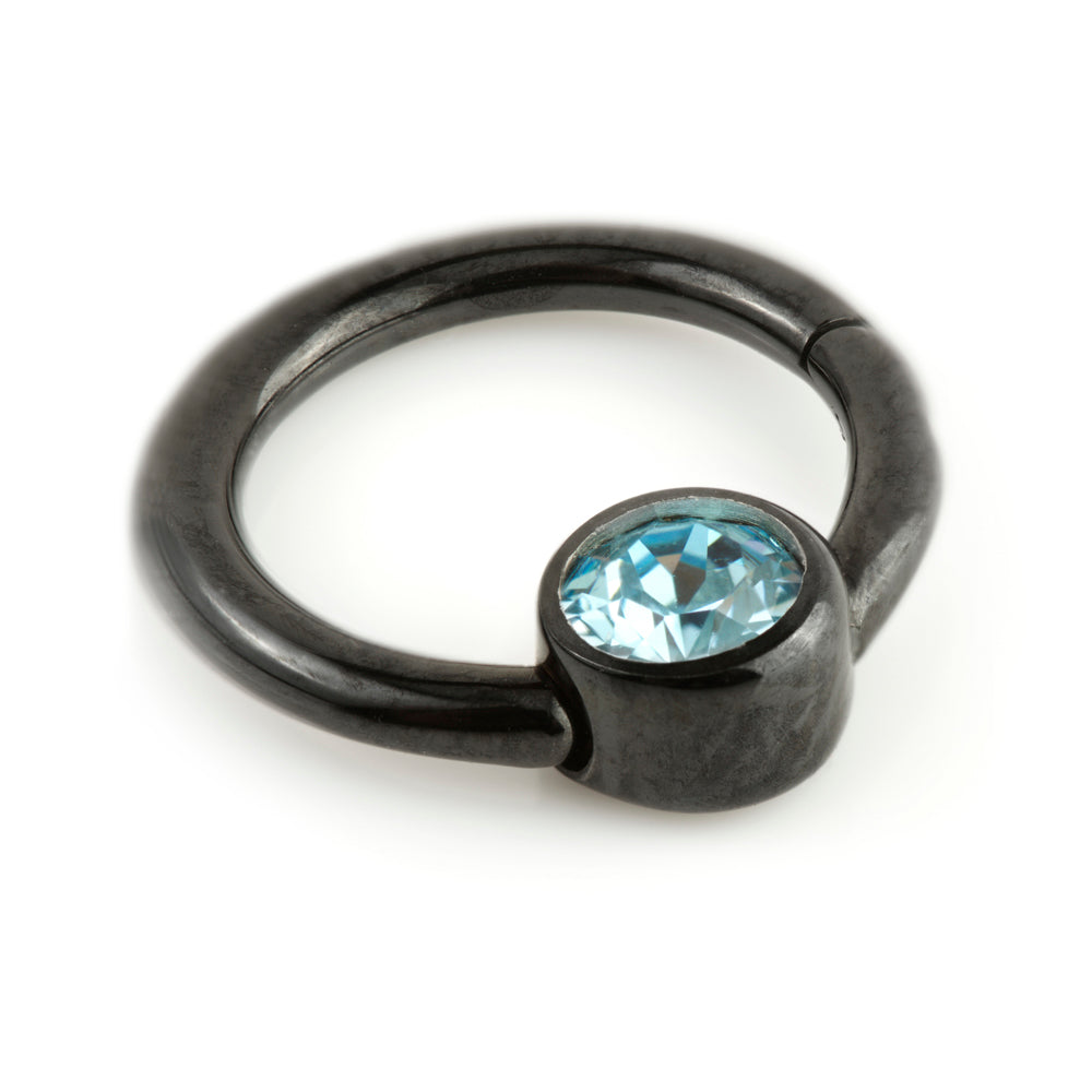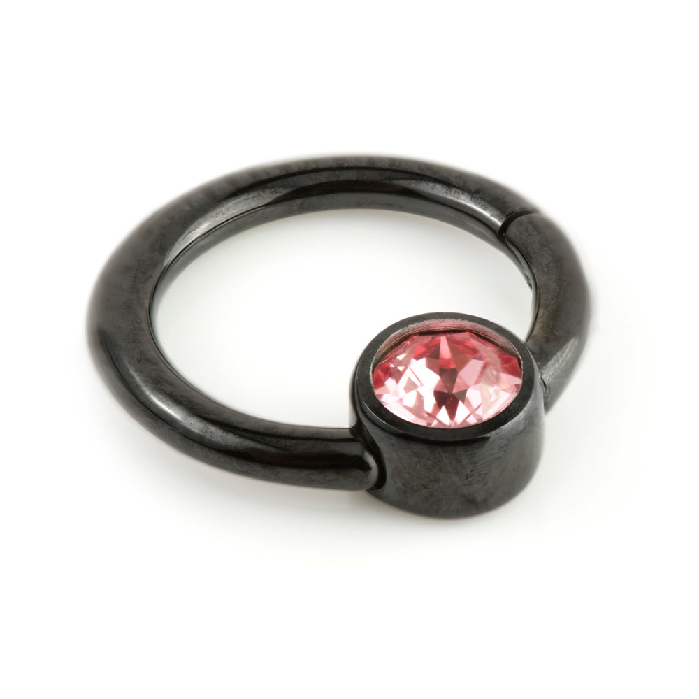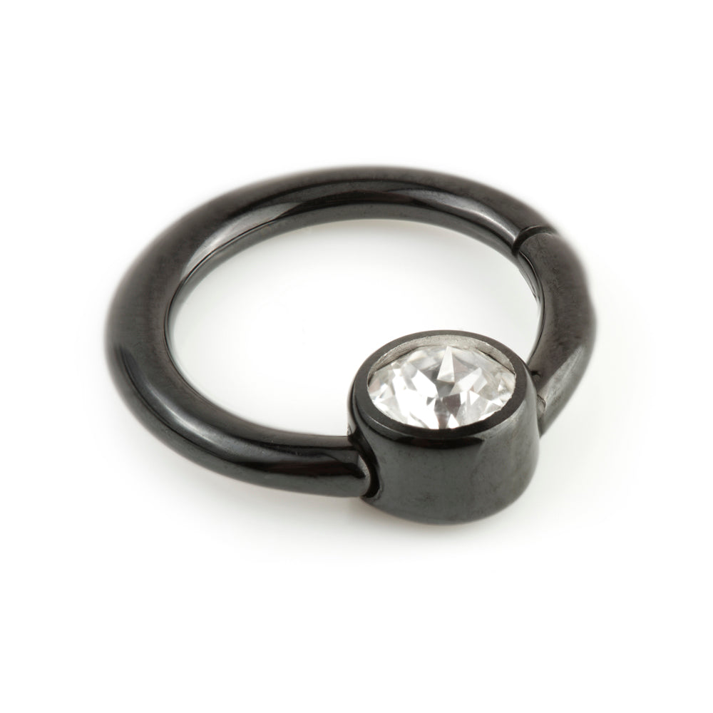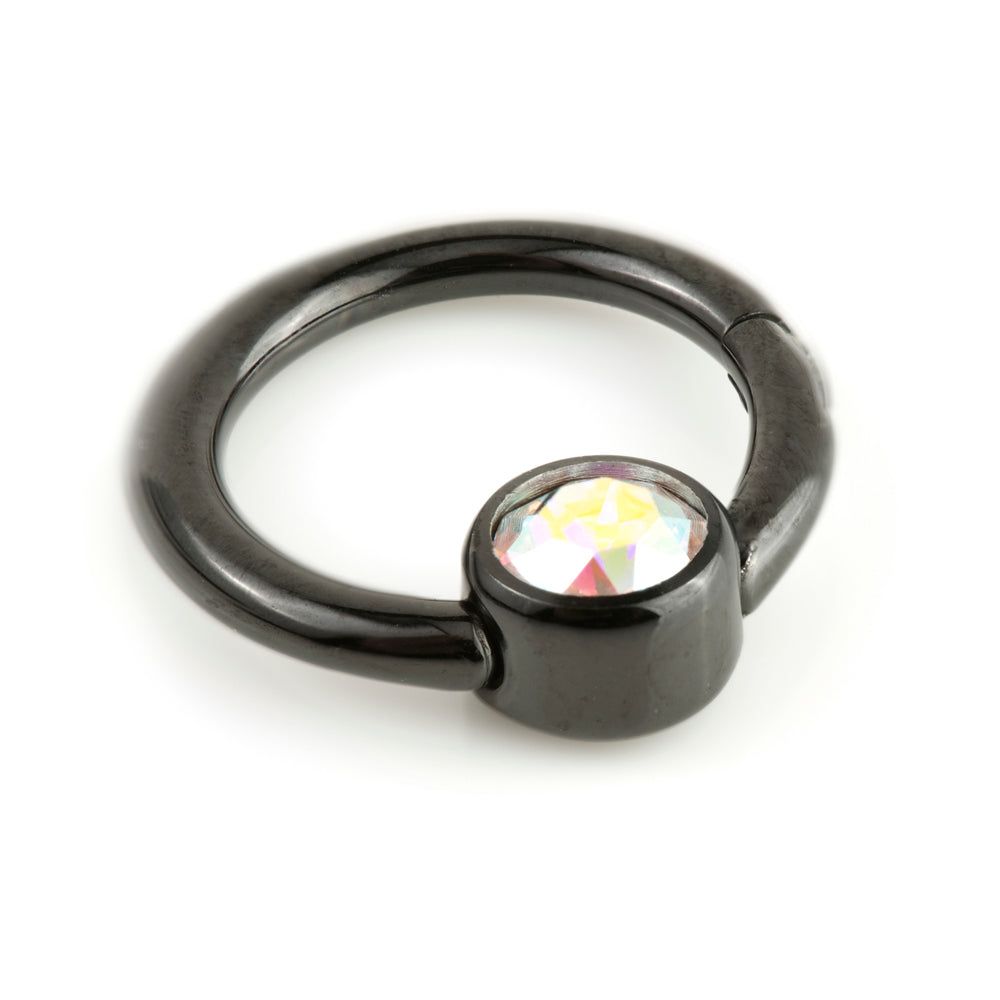 Black PVD on 316L Surgical Steel Hinge Gem Ring Gauge: 1.2mm Size: 8mm Gem Size: 4mm Gem Colour: Crystal, AB, Lt Rose, Aqua