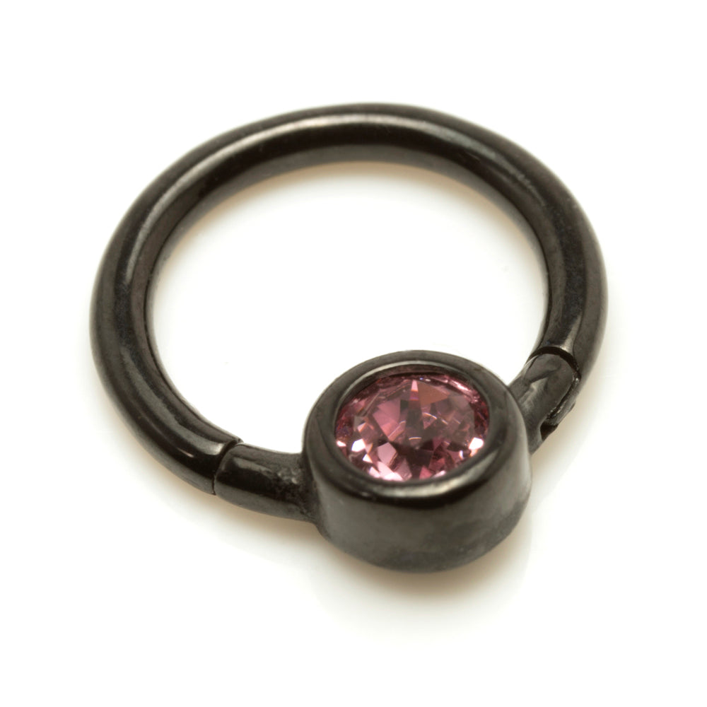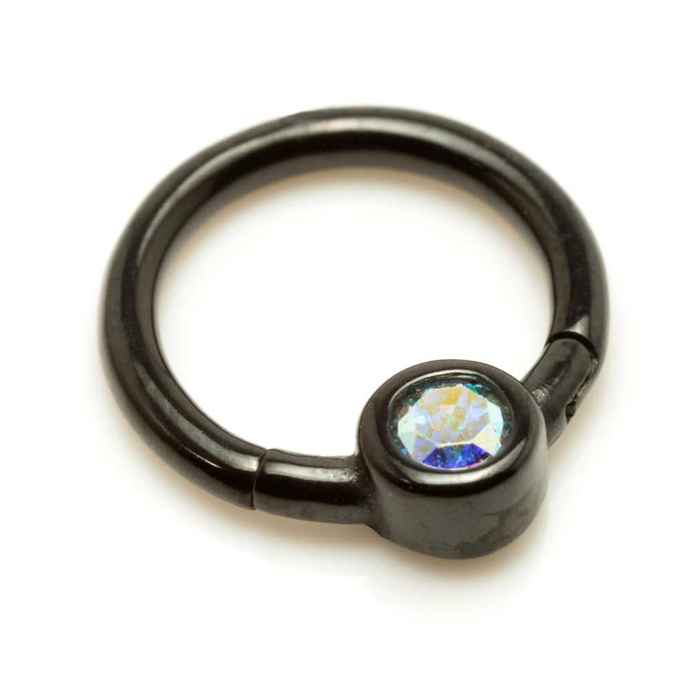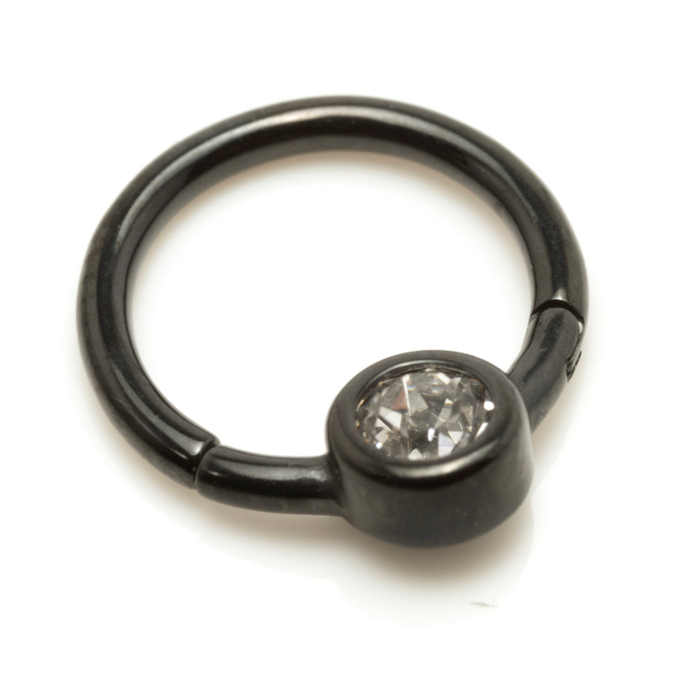 Black PVD on 316L Surgical Steel Hinge Smiley Ring Gauge: 1.2mm Sizes: 7mm, 8mm, 9mm Gem Size: 3mm or 4mm Gem Colour: Crystal, AB, Lt Rose, Aqua