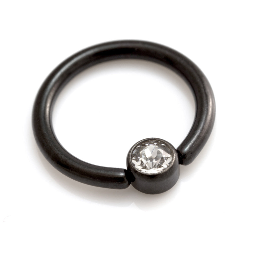 Black PVD on Titanium BCR with Flat Gem Disk - Ideal for smiley piercing and ears Size: 1.2mm x 8mm Disk Size: 3mm or 4mm Gem Colour: Crystal Medical Grade Titanium 6Al-4VEli ASTM:F-136