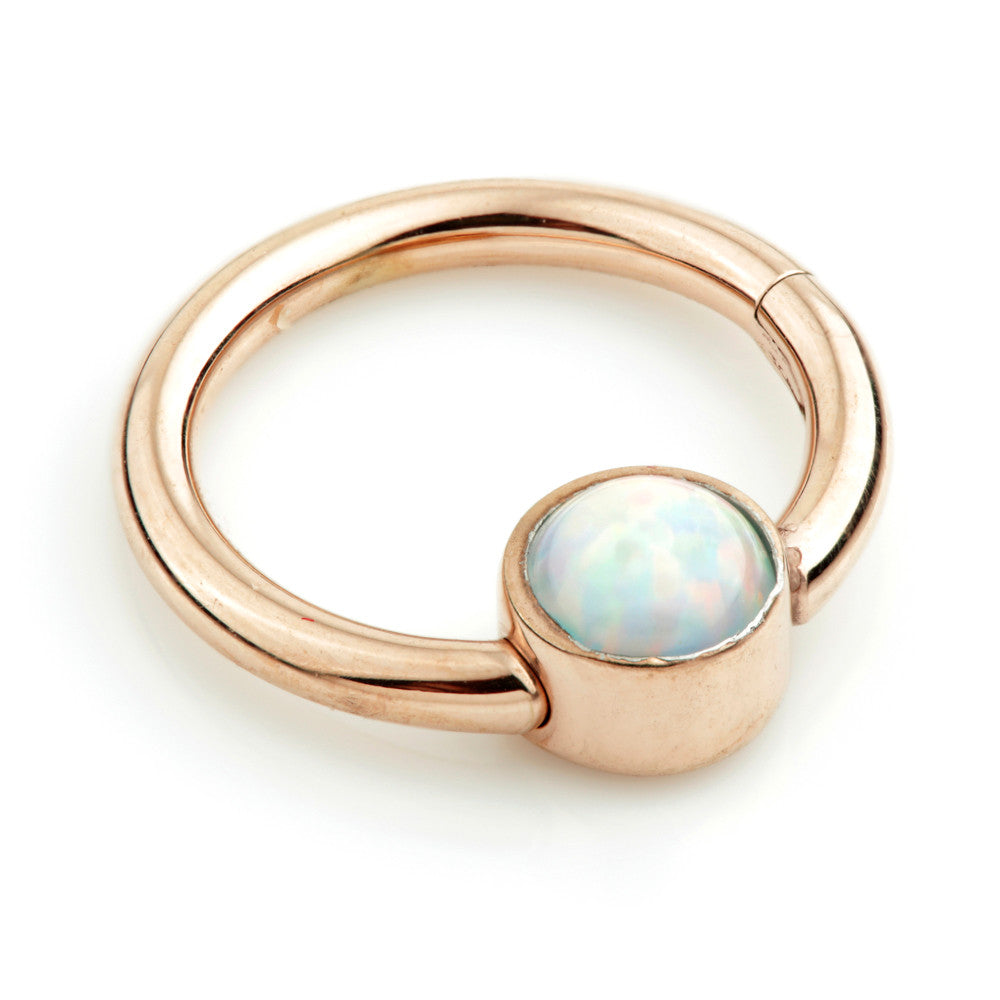Rose Gold PVD on Steel Hinge Segment Ring with Flat Opal Disk Ideal for smiley piercing and ears Size: 1.2mm x 8mm Disk Size: 4mm Opal Colour: White