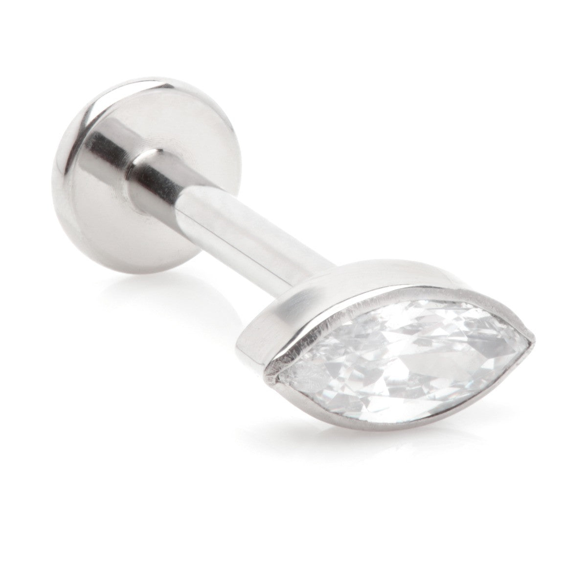 Titanium Threadless Labret with Jewelled Bezel Marquise Attachment Gauge: 1.2mm (0.5mm threadless) Size: 8/10mm Gem Colour: CR CZ Gem Stones Medical Grade Titanium 6Al-4VEli ASTM:F-136