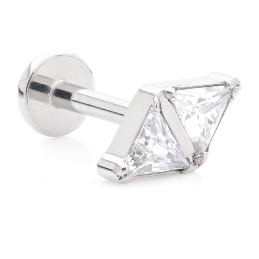 Titanium Threadless Labret with Jewelled Double Triangle Attachment Gauge: 1.2mm (0.5mm threadless) Size: 6/8mm Gem Colour: CR CZ Gem Stones Medical Grade Titanium 6Al-4VEli ASTM:F-136