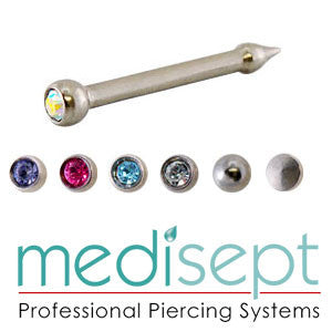 Medisept Nose Studs from Studex are a pre-sterile cartridge base nose piercing system Studs are individually sealed in sterile EU Compliant packs with lot number and date. Sold in pairs. Gauge: 1mm (18g) Ball/Gem Size: 2mm Material: 6al4v Grade titanium Highly Polished Colours and Styles: Rose This piercing system is only supplied to studios and health authority registered trained piercers, not to shops.